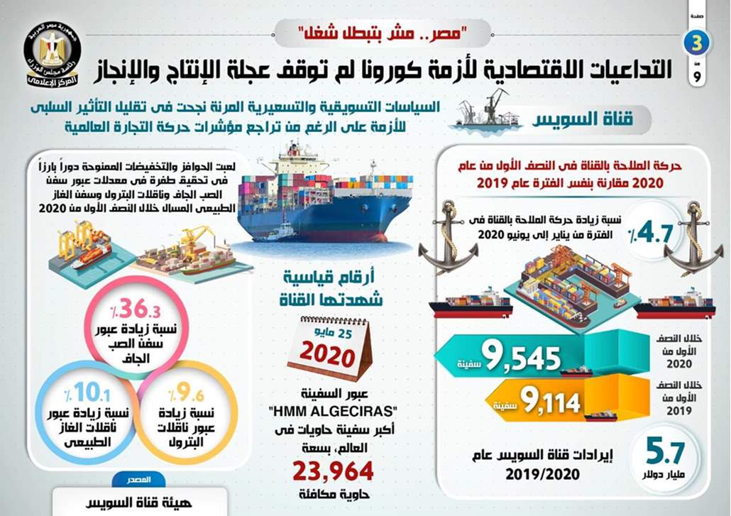 وأبرز التقرير، ارتفاع حركة الملاحة بقناة السويس بنسبة 4.7%، لتصل إلى 9545 سفينة خلال النصف الأول من 2020، مقارنة بـ 9114 سفينة خلال نفس الفترة من عام 2019، كما وصلت إيرادات القناة إلى 5.7 مليار دولار عام 2019/2020، فضلاً عن نجاح السياسات التسويقية والتسعيرية المرنة، في تقليل التأثير السلبي للأزمة، على الرغم من تراجع مؤشرات حركة التجارة العالمية، كما لعبت الحوافز والتخفيضات الممنوحة، دوراً بارزاً في تحقيق طفرة في معدلات عبور سفن الصب الجاف وناقلات البترول وسفن الغاز الطبيعي المسال خلال النصف الأول من 2020، حيث زادت عبور سفن الصب الجاف بنسبة 36.3%، وكذلك زيادة عبور ناقلات الغاز الطبيعي بنسبة 10.1%، فضلاً عن زيادة عبور ناقلات البترول بنسبة 9.6%.