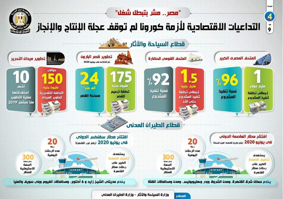 وأصدر المركز الإعلامي لمجلس الوزراء، تقريراً شمل إنفوجرافات تسلط الضوء على عدد من أهم الإنجازات التي تحققت في فترة مواجهة التداعيات الاقتصادية لأزمة كورونا.