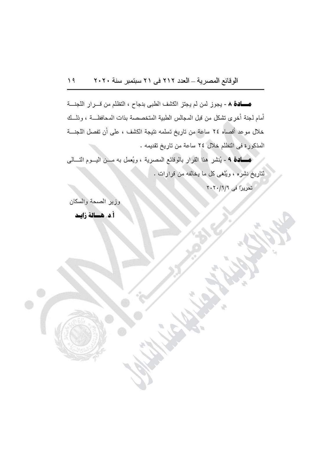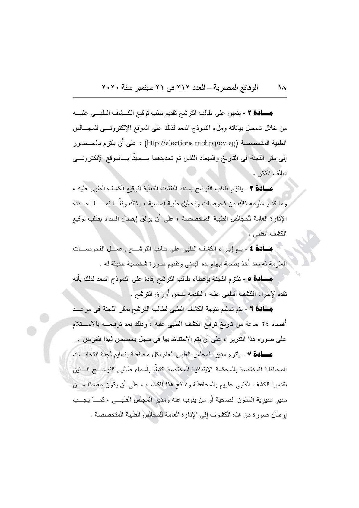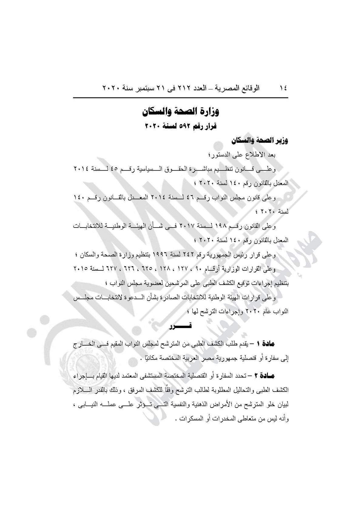 ونشرت ايضا القرار رقم 593 لسنة 2020، بشأن تولي الإدارة العامة للمجالس الطبية المتخصصة توقيع الكشف الطبي على طالب الترشح لعضوية مجلس النواب، بمعرفة لجنة تشكل لهذا الغرض بالمجلس الطبي العامفي كل محافظة من محافظات الجمهورية، لبيان خلوه من الأمراض الذهنية والنفسية التي تؤثر على عمله النيابي، وأنه ليس من متعاطي المخدرات والمسكرات.