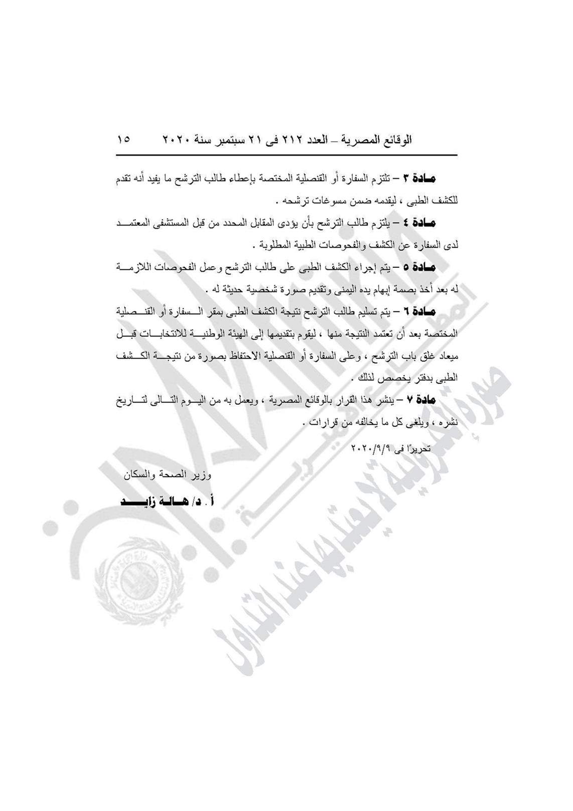 نشرت جريدة الوقائع المصرية في عددها 212، الصادر في 21 سبتمبر 2020، 3 قرار وزارة الصحة والسكان بشأن تقديم طلب الكشف الطبي من المترشح لمجلس النواب المقيم في الخارج، وتولي الإدارة العامة للمجالس الطبية المتخصصة توقيع الكشف الطبي على طالب الترشح لعضوية مجلس النواب.