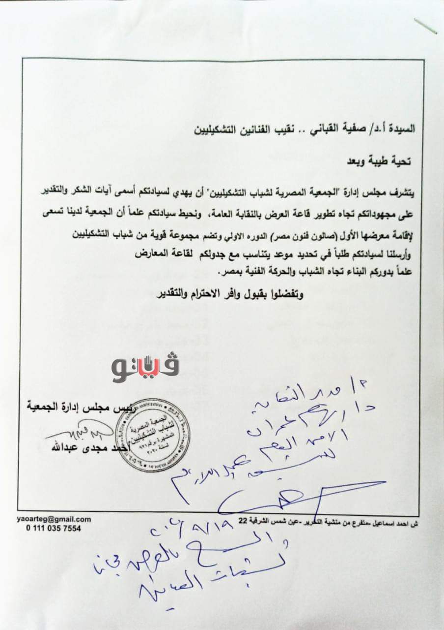 أعلنت الدكتورة صفية القباني، نقيب الفنانين التشكيليين ، و عميدة كلية الفنون الجميلة بالزمالك سابقاً، عن إقامة أول معرض للشباب الفنانين التشكيليين بقاعة النقابة، يحمل المعرض اسمـ "صالون فنون مصر"، ويقام خلال شهر أكتوبر المقبل.