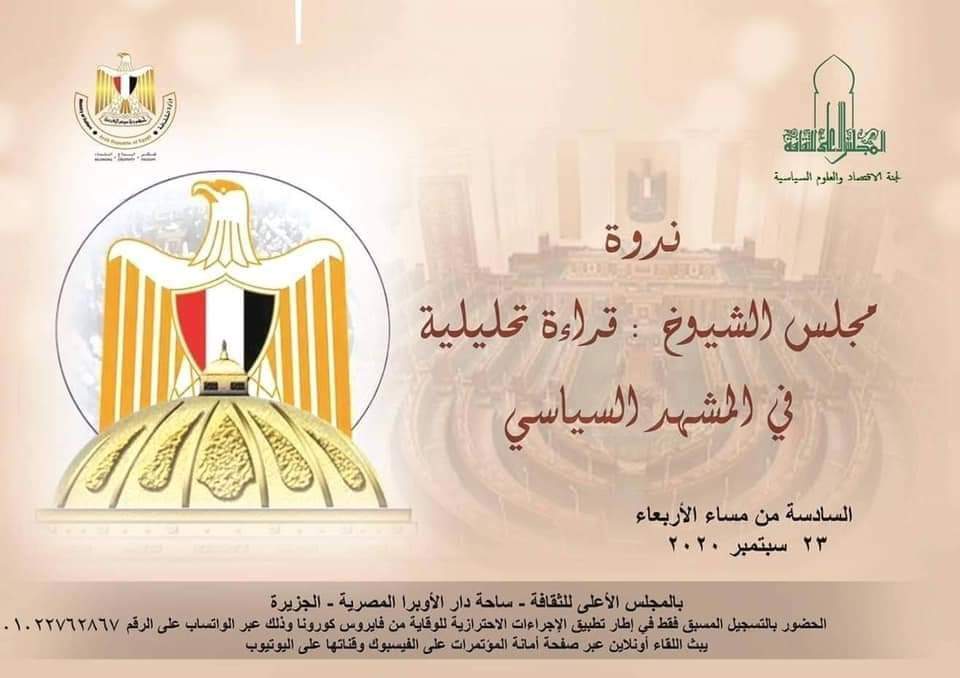 ينظم المجلس الأعلى للثقافة، بأمانة الدكتور هشام عزمى، والدكتور جمال زهران نائب مقرر لجنة الاقتصاد والعلوم السياسية بالمجلس يوم الأربعاء الموافق 23 سبتمبر الجارى، ندوة "مجلس الشيوخ.. قراءة تحليلية فى المشهد السياسي".