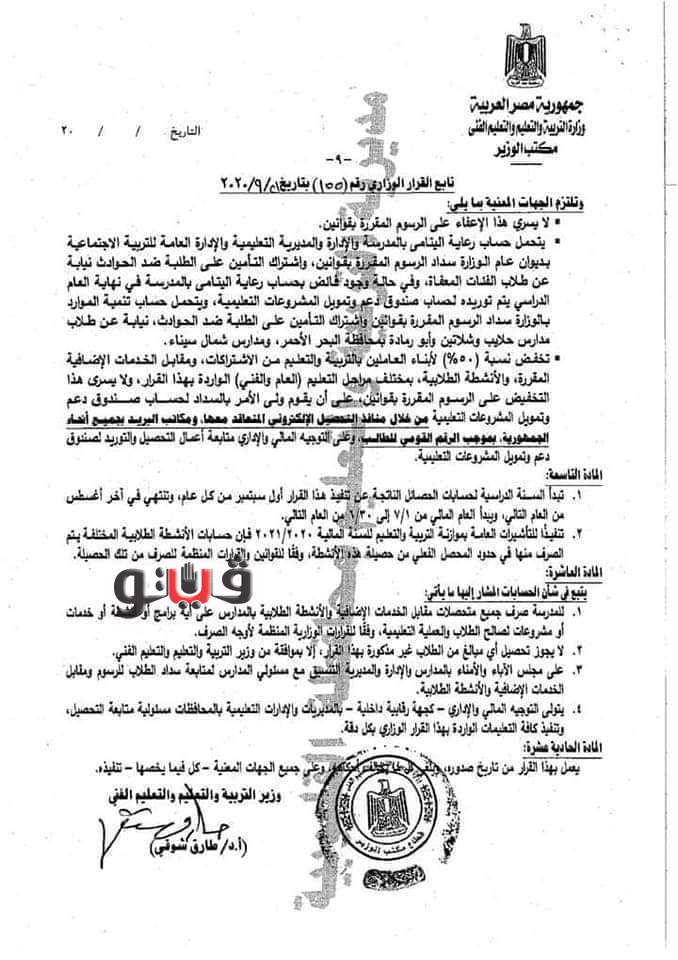 حددت وزارة التربية والتعليم والتعليم الفني المصروفات الدراسية للعام الدراسي الجديد 2020،2021، لطلاب المدارس الحكومية، موضحة أنه في مرحلة رياض الأطفال حتى الصف الثالث الابتدائي 300 جنيه، ومن الصف الرابع حتى الثالث الإعدادي 200 جنيه، ومن الصف الأول الثانوي حتى الصف الثالث الثانوي 500 جنيه، وصفوف التعليم الثانوي الفني بكافة أنواعه وأنظمته 200 جنيه.