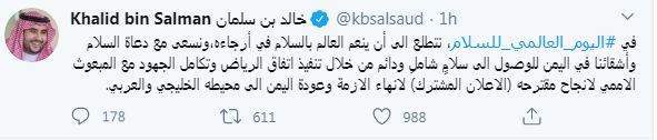 وكتب بن سلمان في تغريدة له على "تويتر": "في #اليوم_العالمي_للسلام نتطلع إلى أن ينعم العالم بالسلام في أرجائه، ونسعى مع دعاة السلام وأشقائنا في اليمن للوصول إلى سلامٍ شاملٍ ودائم من خلال تنفيذ اتفاق الرياض وتكامل الجهود مع المبعوث الأممي لإنجاح مقترحه (الإعلان المشترك) لإنهاء الأزمة وعودة اليمن إلى محيطه الخليجي والعربي".