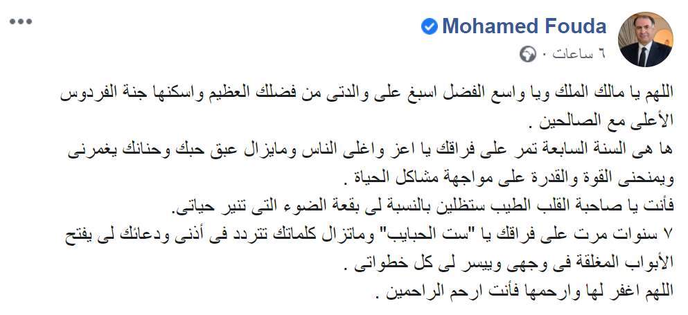 تابع: "أنت يا صاحبة القلب الطيب ستظلين بالنسبة لى بقعة الضوء التى تنير حياتي، 7 سنوات مرت على فراقك يا ست الحبايب، وماتزال كلماتك تتردد فى أذنى ودعائك لى يفتح الأبواب المغلقة فى وجهى وييسر لى كل خطواتي، اللهم اغفر لها وارحمها فأنت ارحم الراحمين".