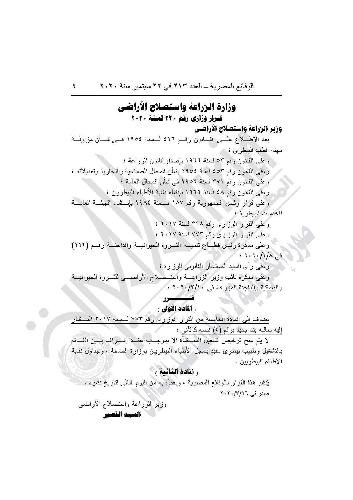 نشرت جريدة الوقائع المصرية في عددها رقم 213، الصادر في 22 سبتمبر 2020، قرار وزارة الزراعة واستصلاح الأراضي رقم 220 لسنة 2020، بشأن عدم منح ترخيص تشغيل المنشأة إلا بموجب عقد إشراف بين القائم بالتشغيل وطبيب بيطري مقيد بسجل الأطباء البيطريين بوزارة الصحة، وجداول نقابة الأطباء البيطريين.