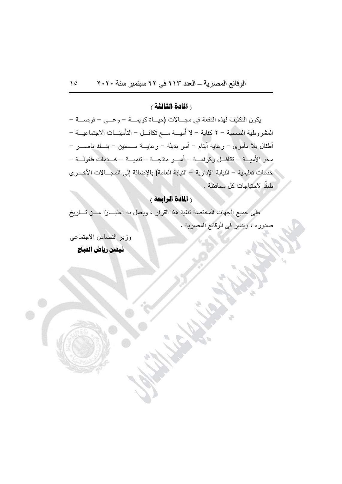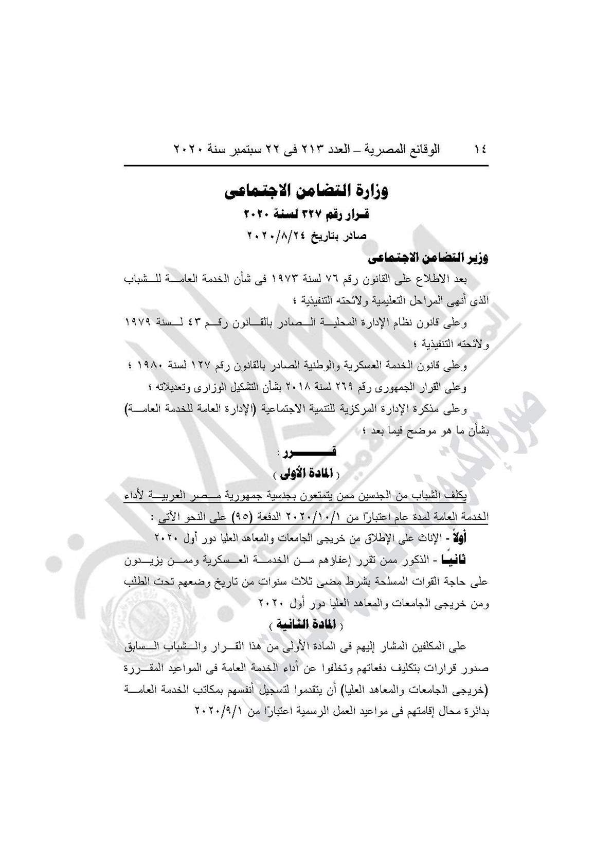 نشرت جريدة الوقائع المصرية في عددها رقم 213، الصادر في 22 سبتمبر 2020، قرار وزارة التضامن الاجتماعي رقم 327 لسنة 2020، بشأن تكليف الشباب من الجنسين ممن يتمتعون بجنسية جمهورية مصر العربية لأداء الخدمة العامة لمدة عام اعتبارًا من 1/10/2020 الدفعة 95.