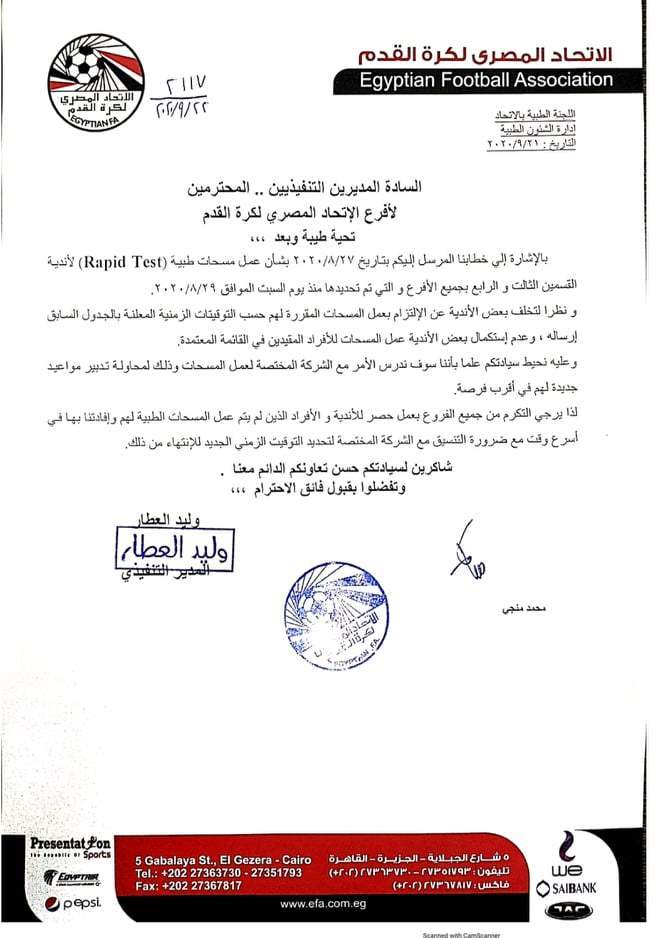 وكان اتحاد الكرة حدد في خطاب رسمي مرسل للفروع والمدير التنفيذي بكل فرع مواعيد خضوع الأندية ومراكز الشباب للتحاليل "رابيد تيست" بتاريخ 27 أغسطس الماضي.