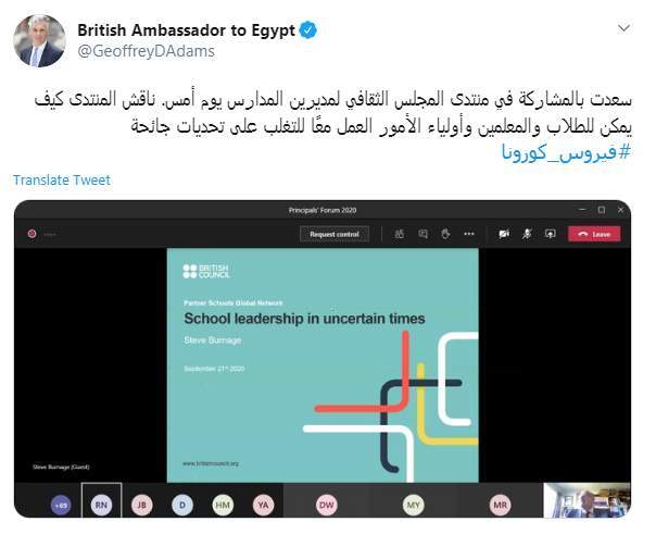 عبر السير جيفري آدامز، السفير البريطاني في مصر، عن سعادته للمشاركة في منتدى المجلس الثقافي لمديري المدارس، الذي عُقد بمقر المركز الثقافي البريطاني أمس الاثنين، وناقش كيفية عمل أولياء الأمور والمعلمين والطلاب معًا للتغلب على جائحة كورونا.