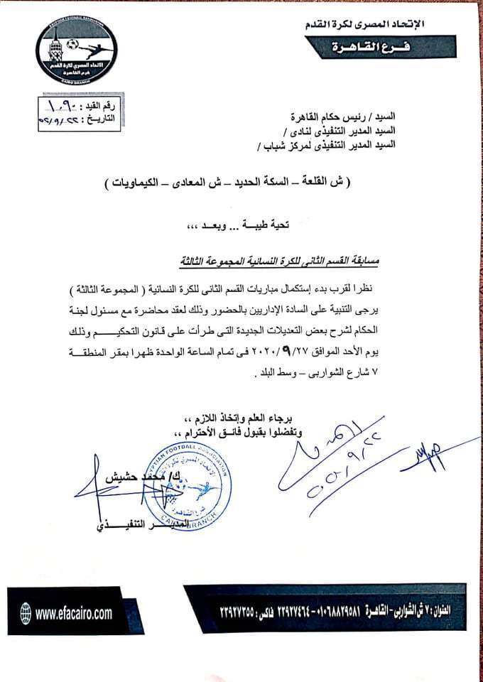 وأكدت منطقة القاهرة في خطاب رسمي معتمد من محمد حشيش المدير التنفيذي للمنطقة وأيمن حسان مدير إدارة المسابقات موجه لفرق القسم الثاني للكرة النسائية ، تنظيم محاضرة بمقر المنطقة مع مسئول الحكام يوم الأحد 27 سبتمبر الجاري في تمام الواحدة ظهرا بمقر المنطقة بالشواربي.