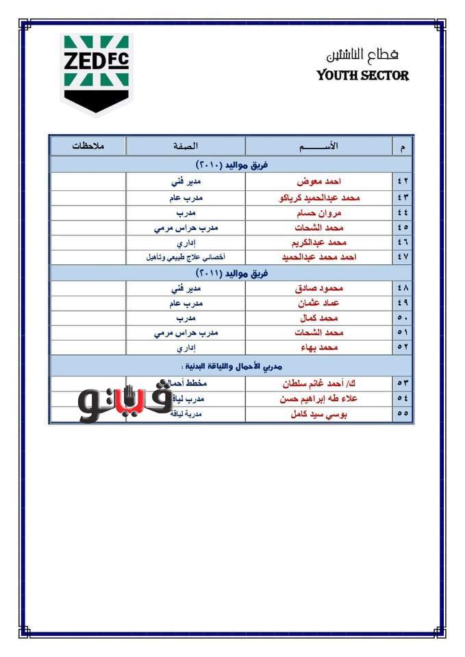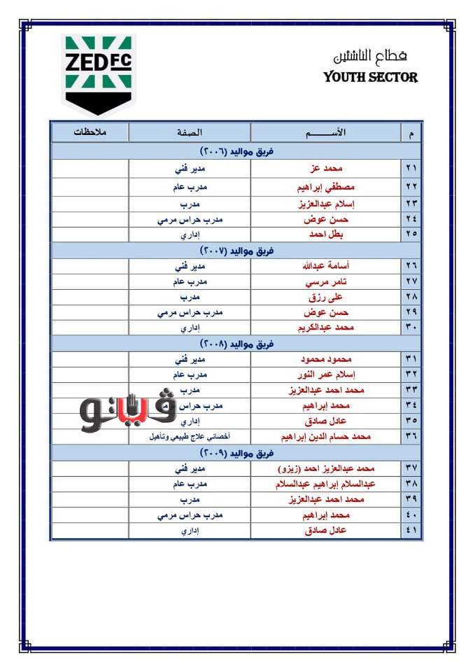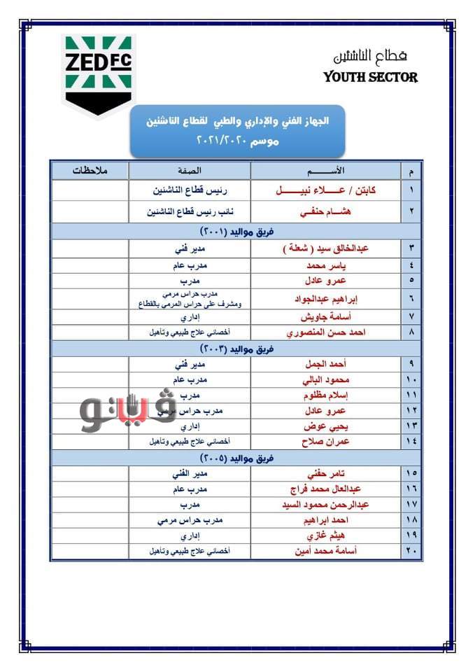 وتولى علاء نبيل المدير الفني السابق لمنتخب مصر والمقاولون العرب والمنتخب الأردني رئاسة قطاع الناشئين بنادي زد ، وهشام حنفي نجم الأهلي السابق نائبا لرئيس القطاع ، وشريف إسلام مدير التعاقدات السابق بالزمالك مديرا اداريا لقطاع الكرة.