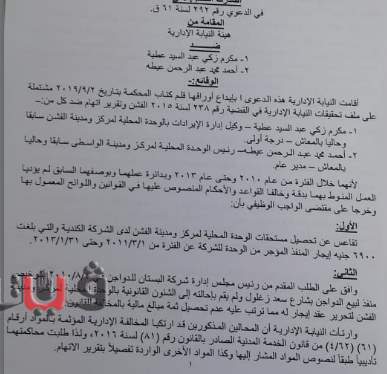 وتبين أن المحال الثاني تقاعس عن تحصيل مستحقات الوحدة المحلية لمركز ومدينة الفشن لدى الشركة الكندية قيمة إيجار المنفذ المؤجر من الوحدة للشركة