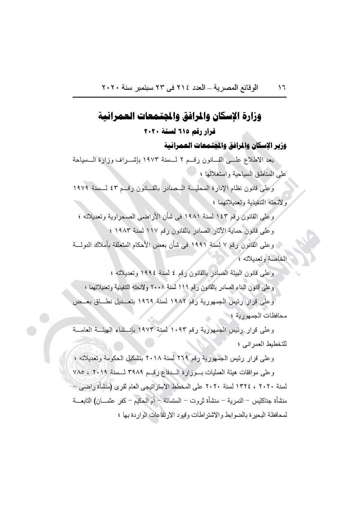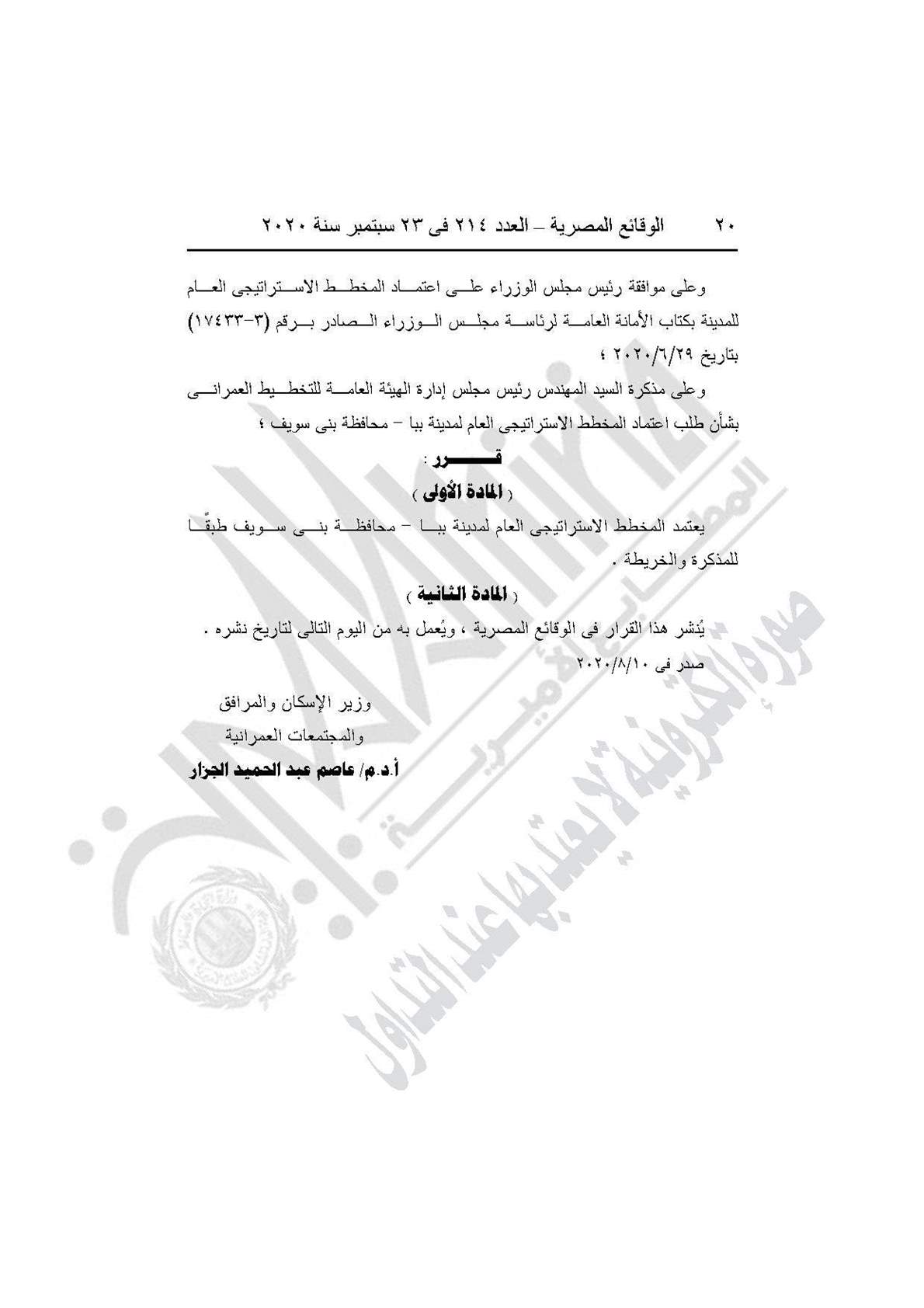 والقرار رقم 616 لسنة 2020، بشأن اعتماد المخطط الاستراتيجي العام لمدينة ببا محافظة بني سويف، طبقًا للمذكرة والخريطة.