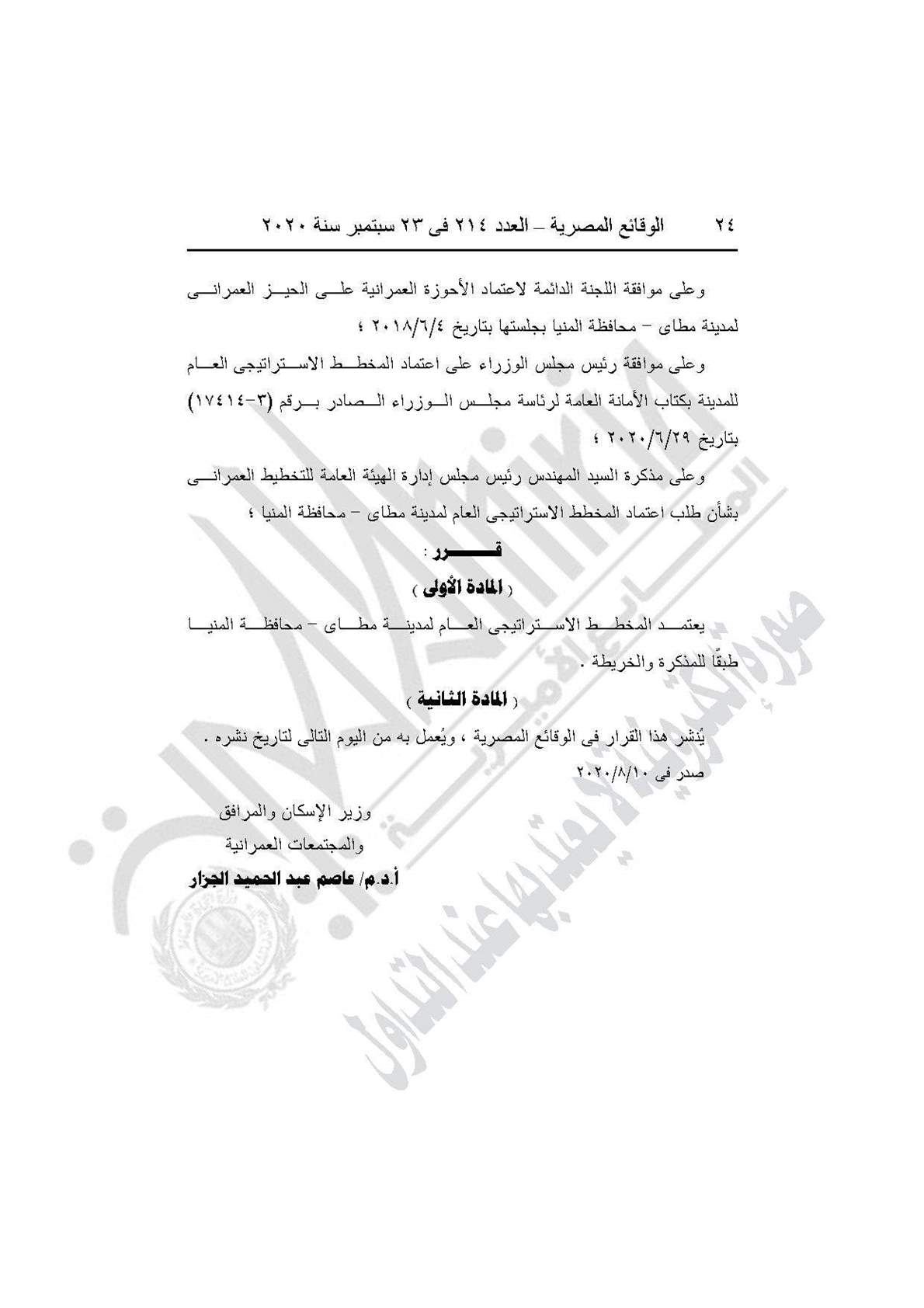 والقرار رقم 618 لسنة 2020، باعتماد المخطط الاستراتيجي العام لمدينة مطاي بمحافظة المنيا طبقًا للمذكرة والخريطة.