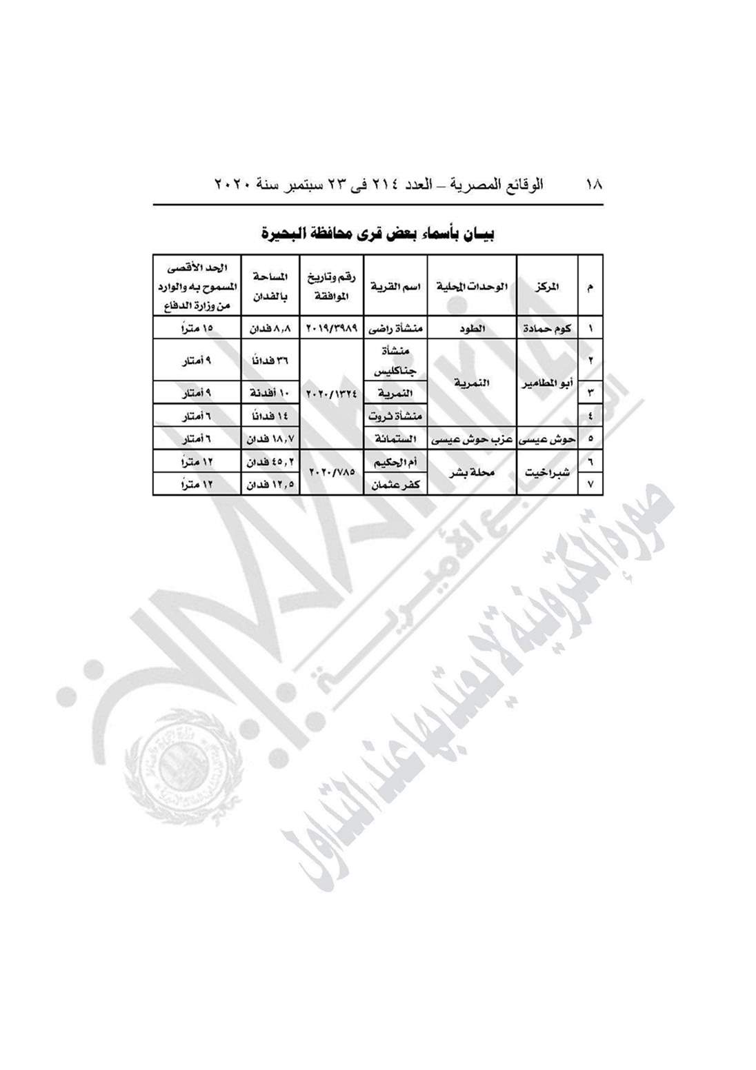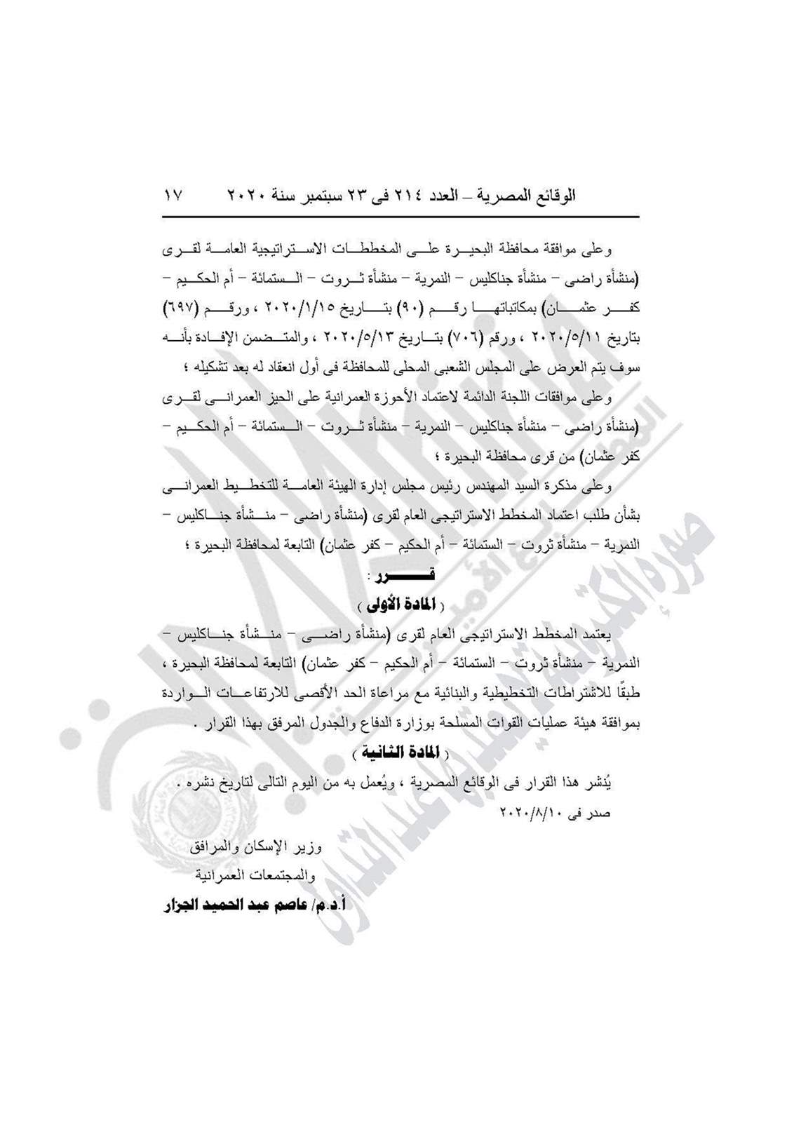 القرار رقم 615 لسنة 2020، بشأن اعتماد المخطط الاستراتيجي العام لقرى (منشأة راضي- منشأة جناكليس- النمرية- منشأة ثروت- الستمائة- أم الحكيم- كفر عثمان) التابعة لمحافظة البحيرة، طبقًا للاشتراطات التخطيطية والبنائية مع مراعاة الحد الأقصى للارتفاعات الواردة بموافقة هيئة عمليات القوات المسلحة بوزارة الدفاع.