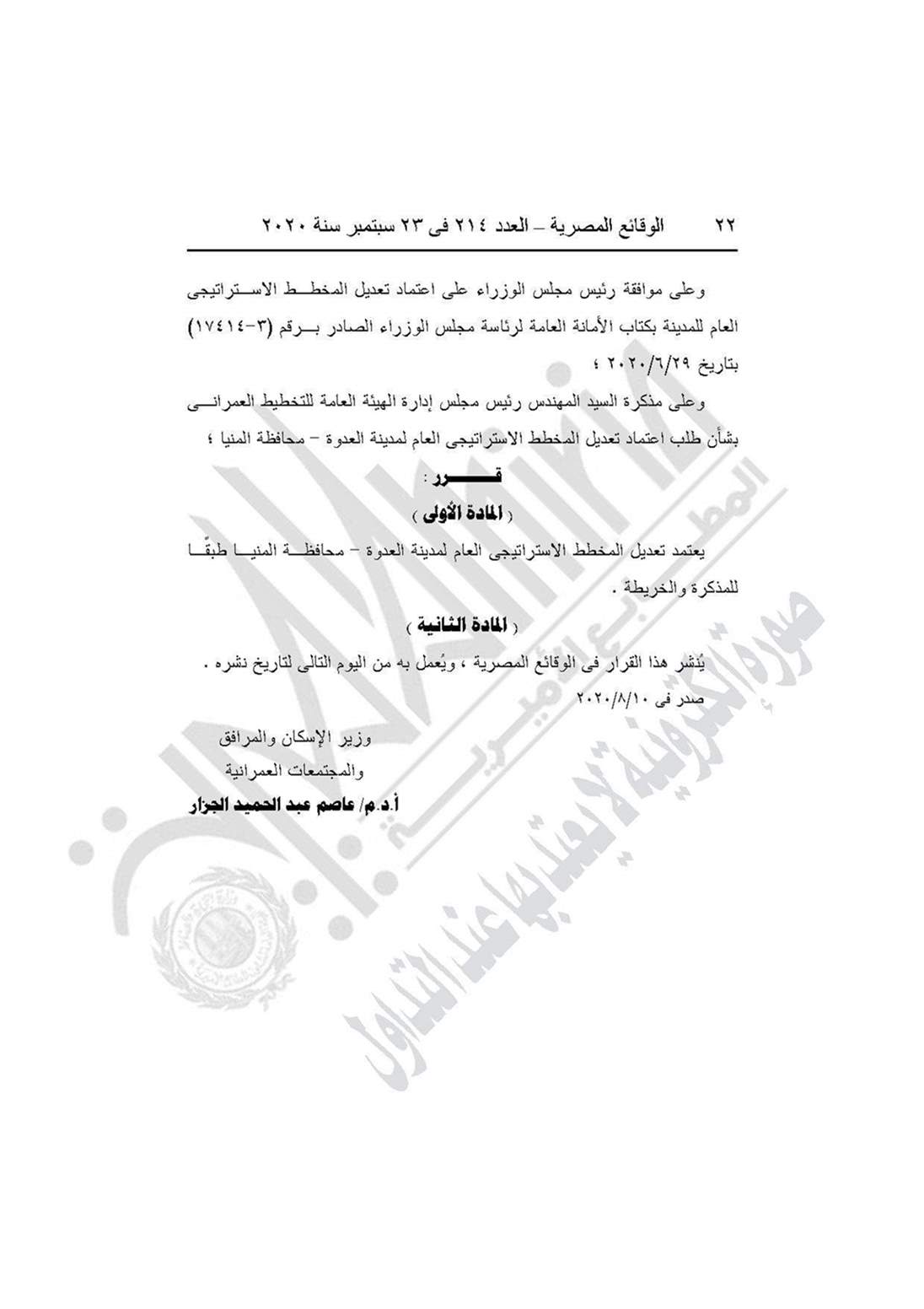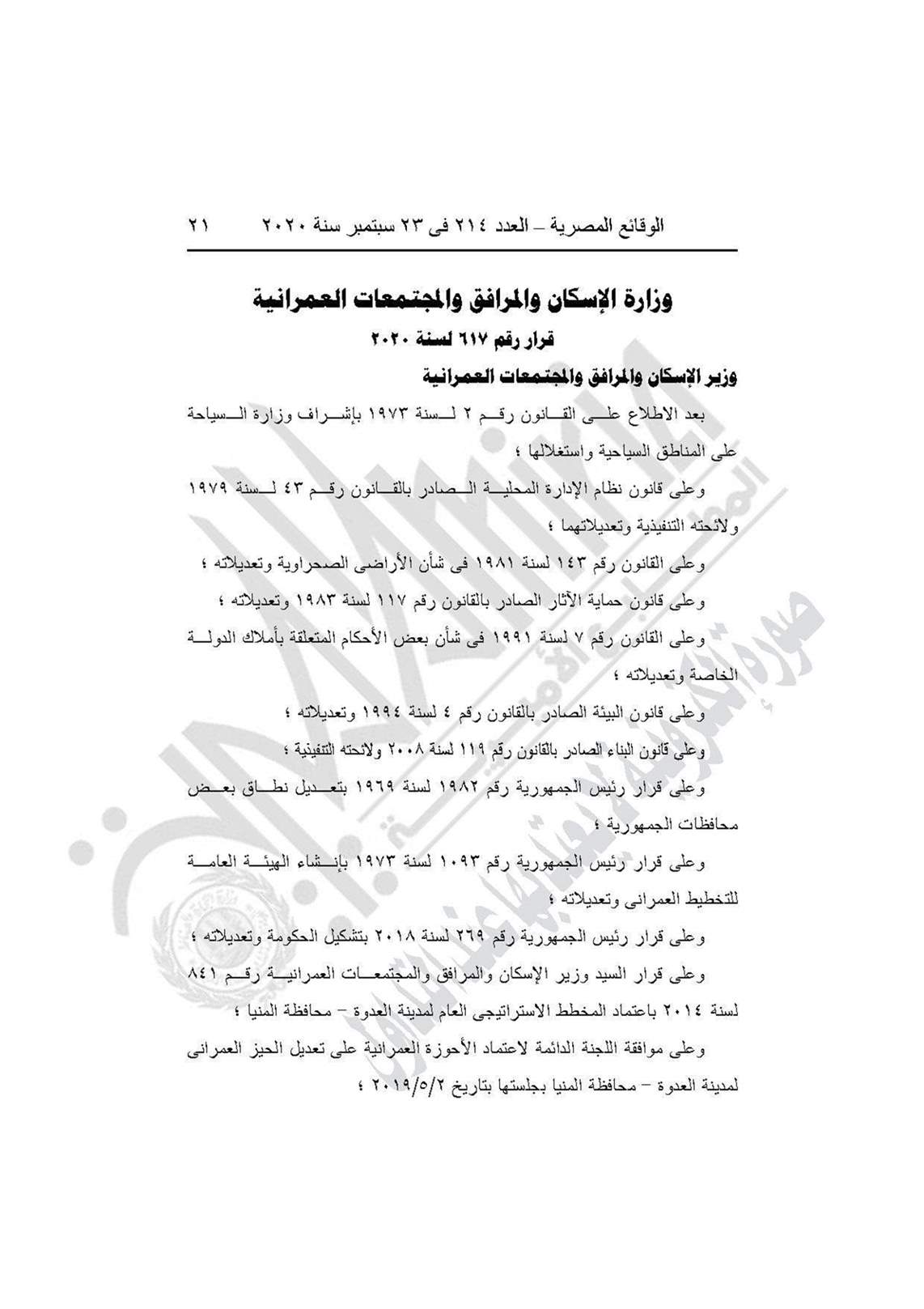 والقرار رقم 617 لسنة 2020، بشأن اعتماد تعديل المخطط الاستراتيجي العام لمدينة العدوة بمحافظة المنيا طبقًا للمذكرة والخريطة.