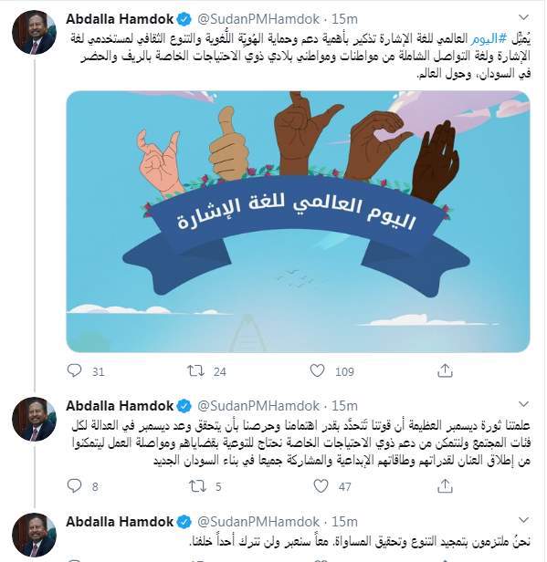 وأضاف حمدوك "يُمثِّل #اليوم العالمي للغة الإشارة تذكير بأهمية دعم وحماية الهُويِّة اللُّغوية والتنوع الثقافي لمستخدمي لغة الإشارة ولغة التواصل الشاملة من مواطنات ومواطني بلادي ذوي الاحتياجات الخاصة بالريف والحضر في السودان، وحول العالم"