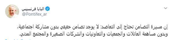 وكتب البابا فرنسيس تغريدة على تويتر "إن مسيرة التضامن تحتاج إلى التعاضد: لا يوجد تضامن حقيقي بدون مشاركة اجتماعية، وبدون مساهمة العائلات والجمعيات والتعاونيات والشركات الصغيرة والمجتمع المدني".