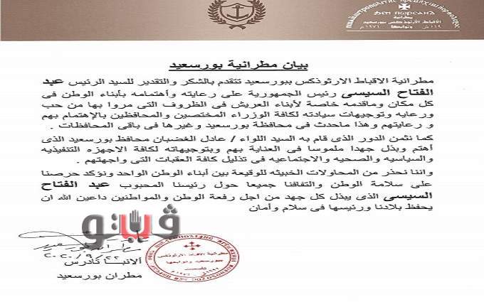 وحذرت المطرانية في بيانها مما أطلقت عليه "المحاولات الخبيثة" للوقيعة بين أبناء الوطن الواحد مؤكدة على حرص مطرانية الأقباط الأرثوذكس ببورسعيد على سلامة الوطن والإلتفاف حول الرئيس عبد الفتاح السيسي، مؤكدة أن الرئيس السيسى يبذل كل الجهد من أجل رفعة الوطن والمواطنين.
