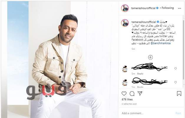 وكتب تامر: «مفاجأة.. إن شاء الله هكون معاكم في حفلة "أونلاين" من "جدة " حفل العيد الوطني السعودي الساعة ١٠ بتوقيت السعودية والساعة ٩ بتوقيت مصر هشوف كل رسايلكم على twitter وعلى Facebook وهتواصل معاكم بنفسي وهغني كل اللي هتطلبوه».