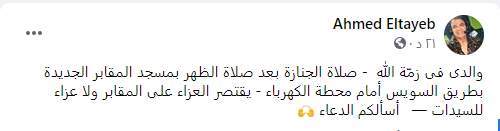 وكتب أحمد الطيب عبر حسابه على موقع التواصل الاجتماعي "فيس بوك": "والدي فى ذمَّة الله، صلاة الجنازة بعد صلاة الظهر بمسجد المقابر الجديدة بطريق السويس أمام محطة الكهرباء".