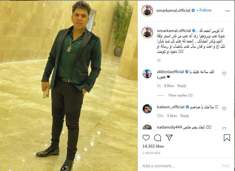 وقال "عمر" عبر حسابه بـ"إنستجرام": "أنا كويس الحمد لله.. شوية تعب ويروحوا زي أي تعب من كتر السفر وقلة النوم وكتر المشاكل.. الحمد لله على كل شيء شكرًا لكل أخ وأخت وفنان سأل عني باتصال أو رسالة أو دعوة أو كومنت".