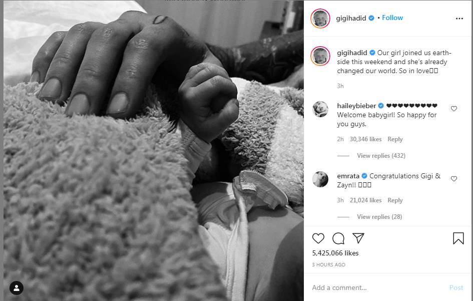 وعبر حسابها على موقع التواصل الاجتماعي "انستجرام"، أعلنت جيجي حديد أنها وضعت مولودها في نهاية الأسبوع الماضي.