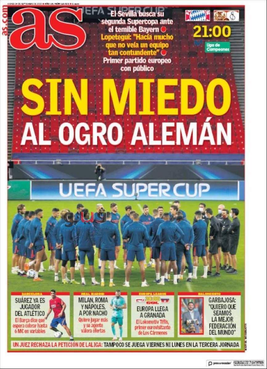 ركزت صحيفة آس الإسبانية عبر غلافها الورقي الرئيسي، الصادر صباح اليوم الخميس، على المباراة التي تجمع بين كل من فريق بايرن ميونخ الألماني كونه بطل دوري أبطال أوروبا أمام فريق إشبيلية الإسباني كونه بطل الدوري الأوروبي في إطار بطولة كأس السوبر الأوروبي، والتي من المقرر إقامتها في العاصمة المجرية بودابست على ملعب بوشكاش أرينا، مساء اليوم.