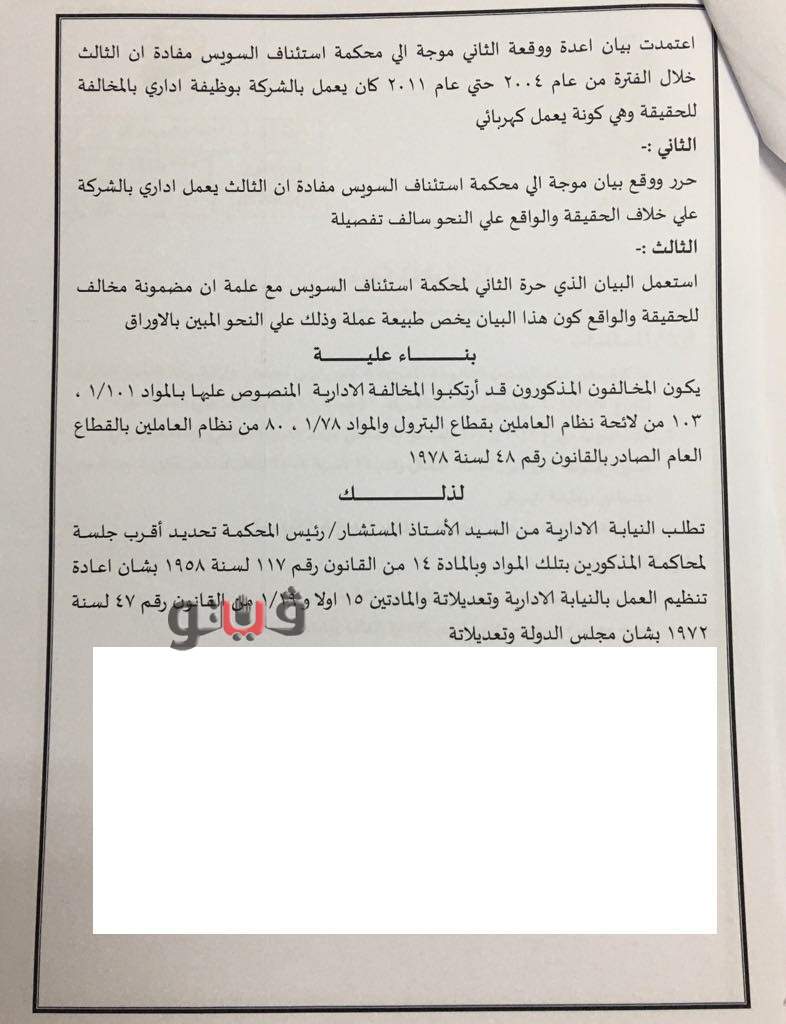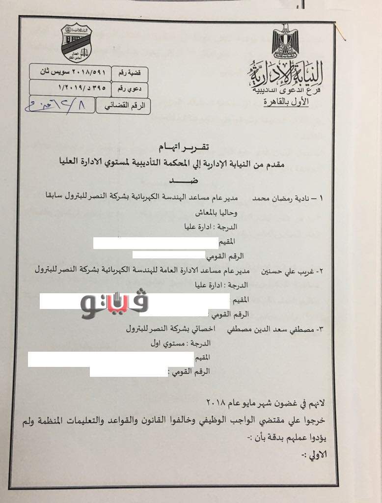وكشفت التحقيقات أن نادية رمضان محمد، مدير عام مساعد الهندسة الكهربائية بشركة النصر للبترول اعتمدت قبل إحالتها للمعاش بيان ووقعه المحال الثاني موجه إلى محكمة استئناف السويس يتضمن أن المحال الثالث خلال الفترة من عام 2004 حتى عام 2011 كان يعمل بالشركة جهة عمله بوظيفة إداري بالمخالفة للحقيقة وهو كونه يعمل كهربائيا.