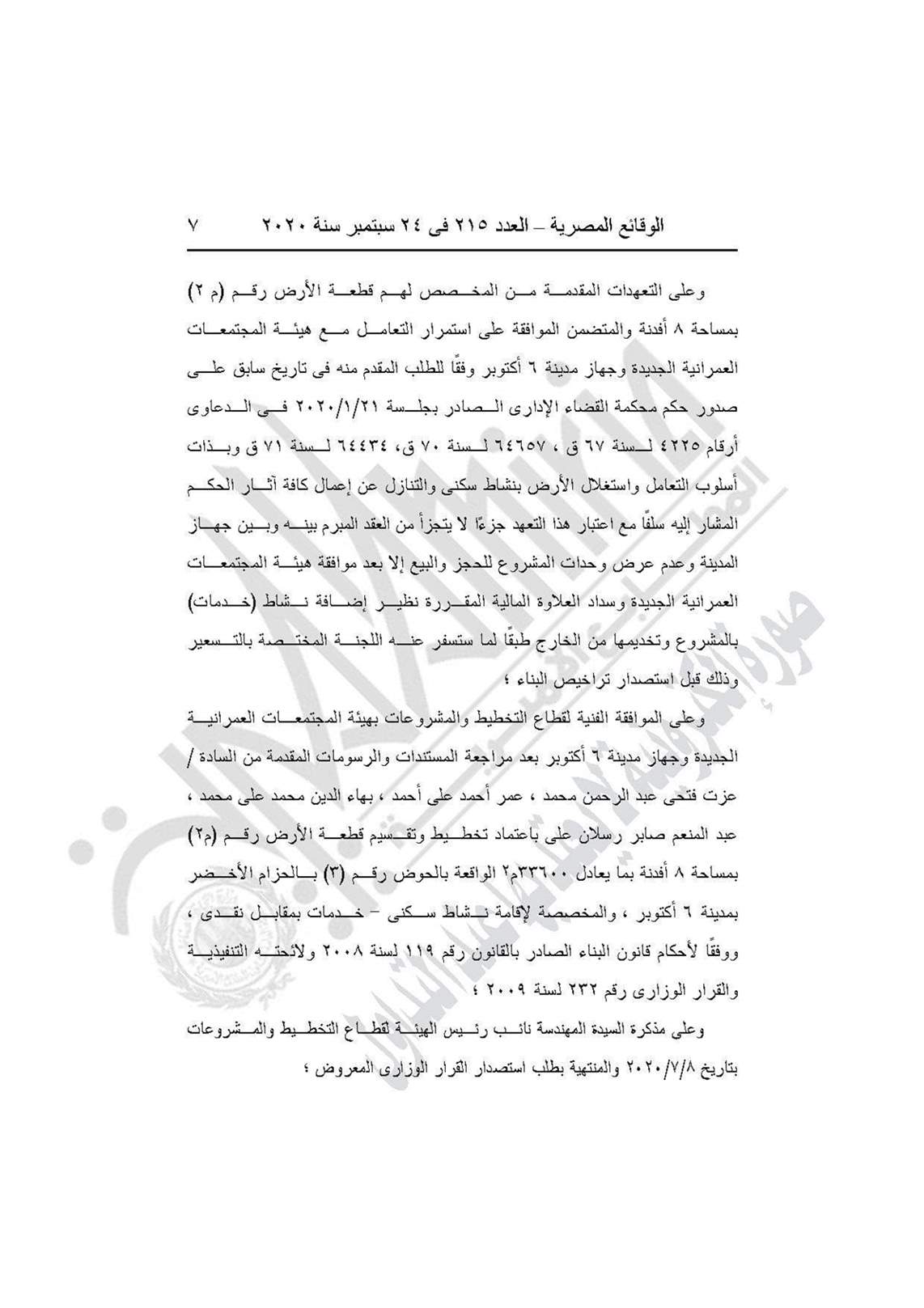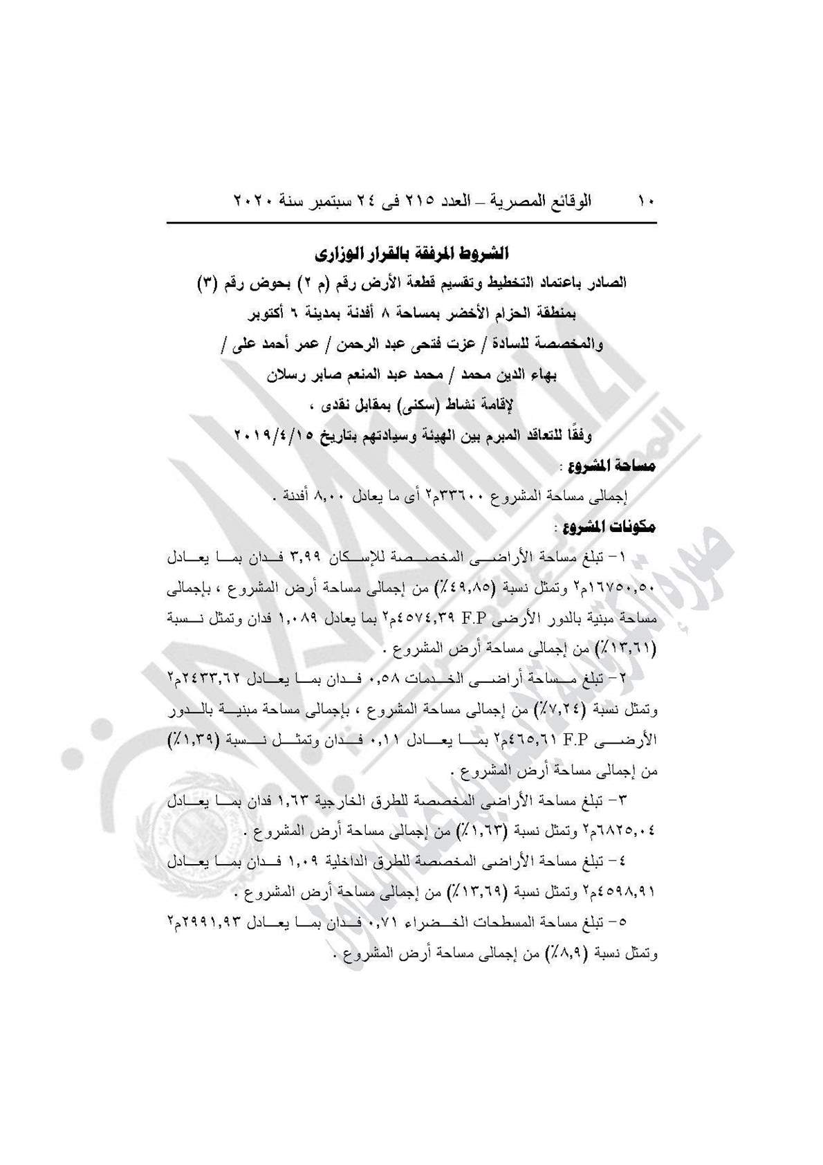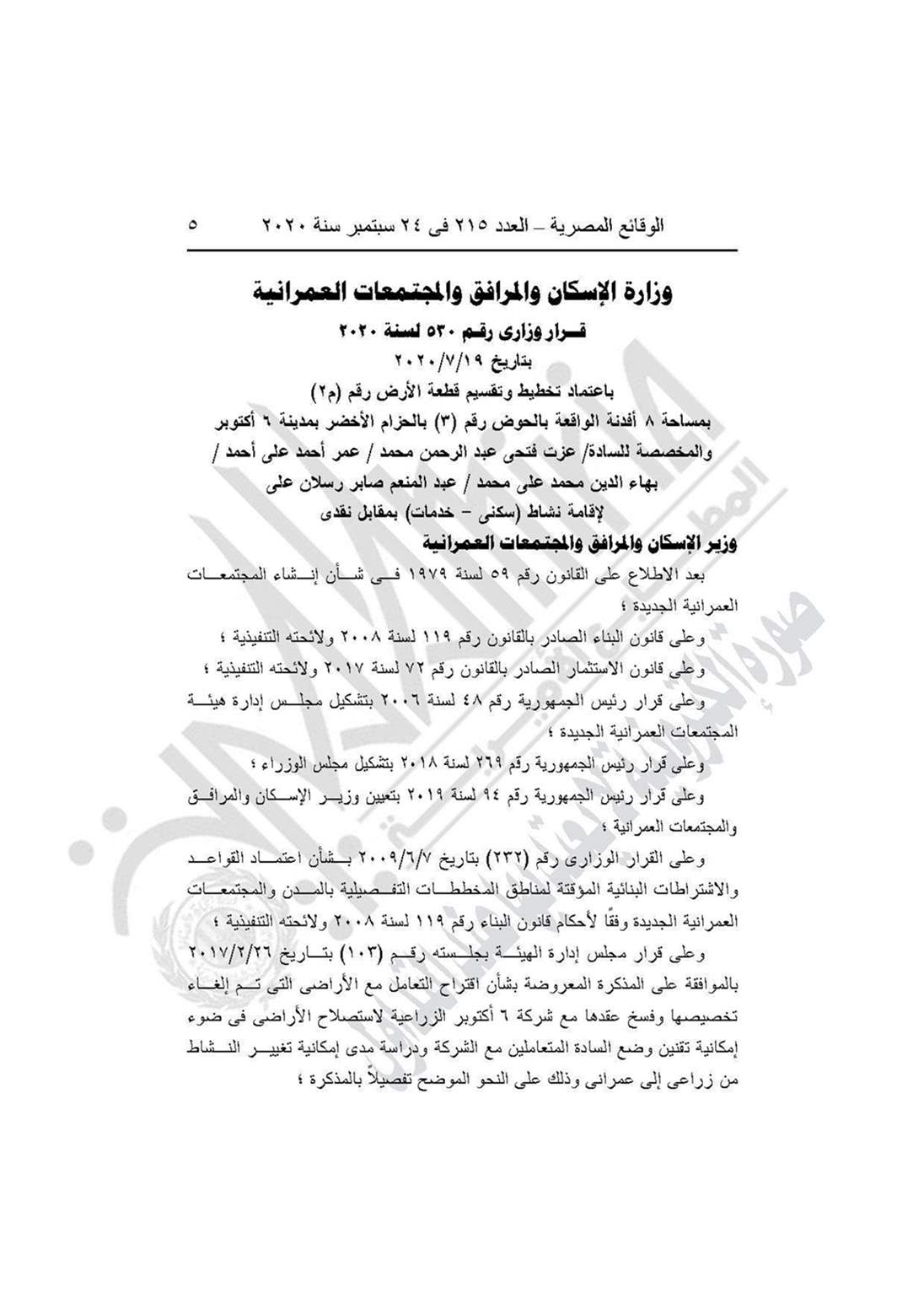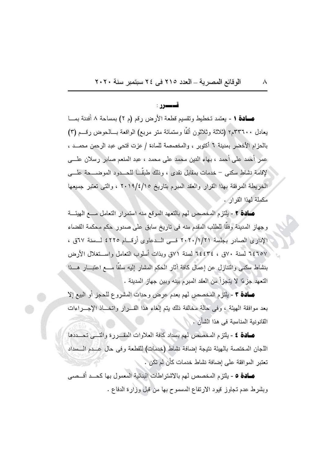 - القرار رقم 530 لسنة 2020، باعتماد تخطيط وتقسيم قطعة الأرض رقم (م2) بمساحة 8 أفدنة الواقعة بالحوض رقم 3 بالحزام الأخضر بمدينة 6 أكتوبر لإقامة نشاط (سكني- خدمات) بمقابل نقدي.