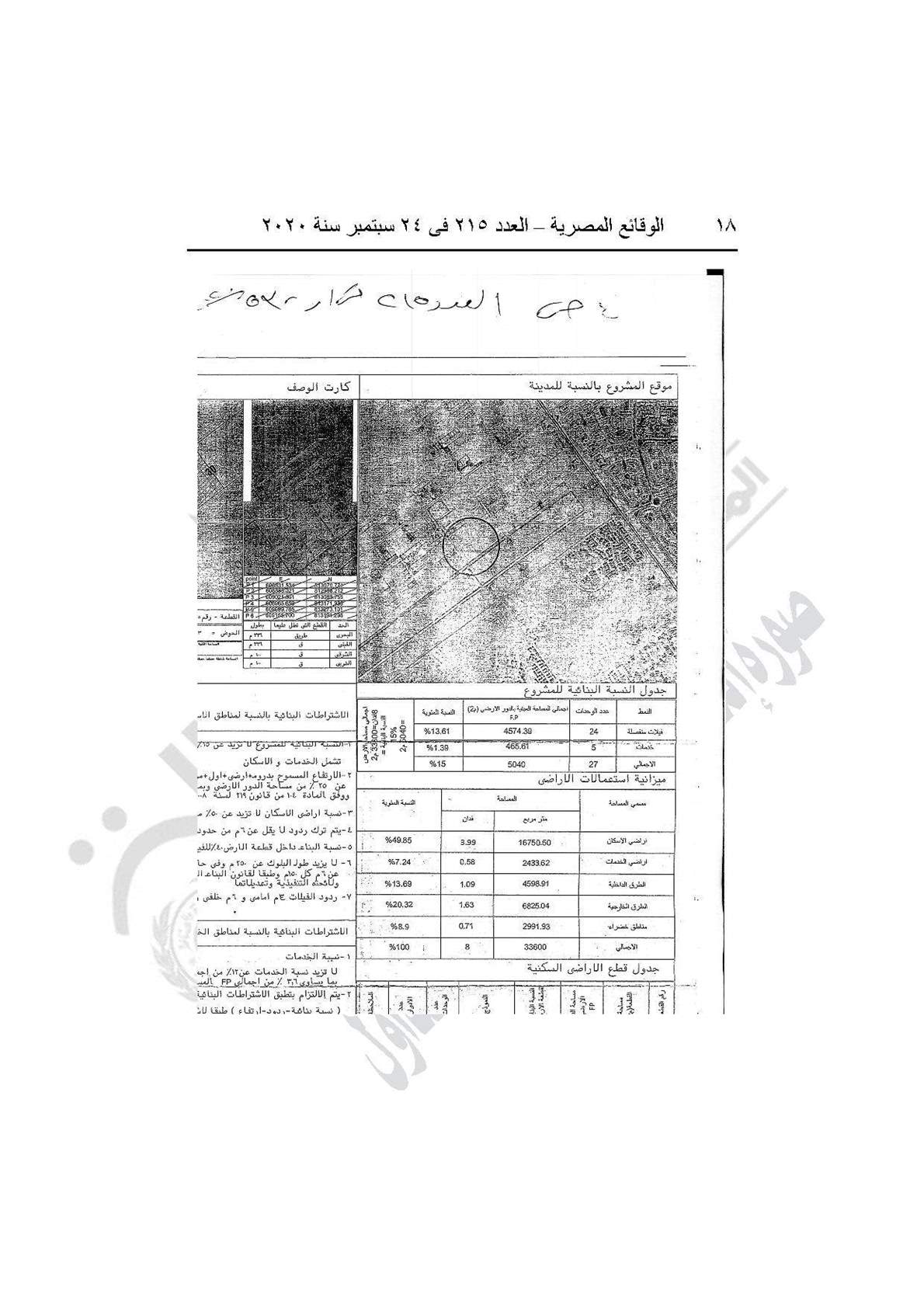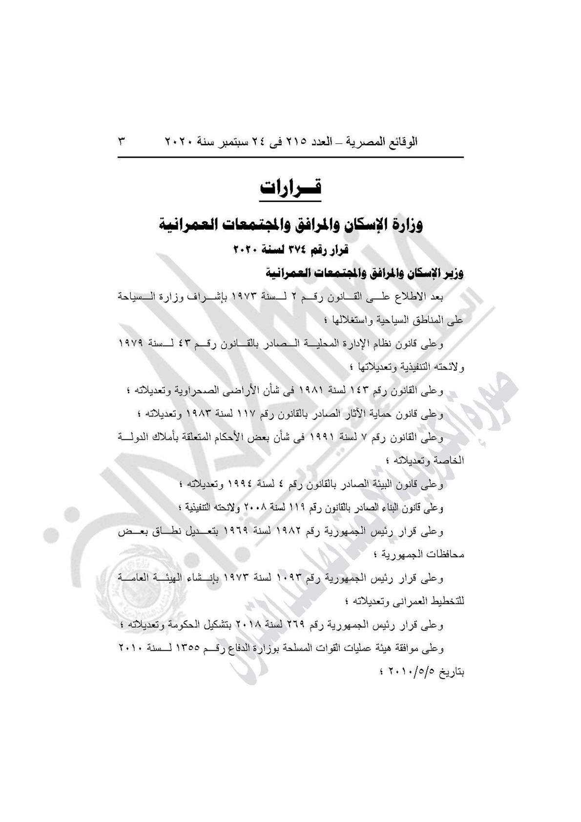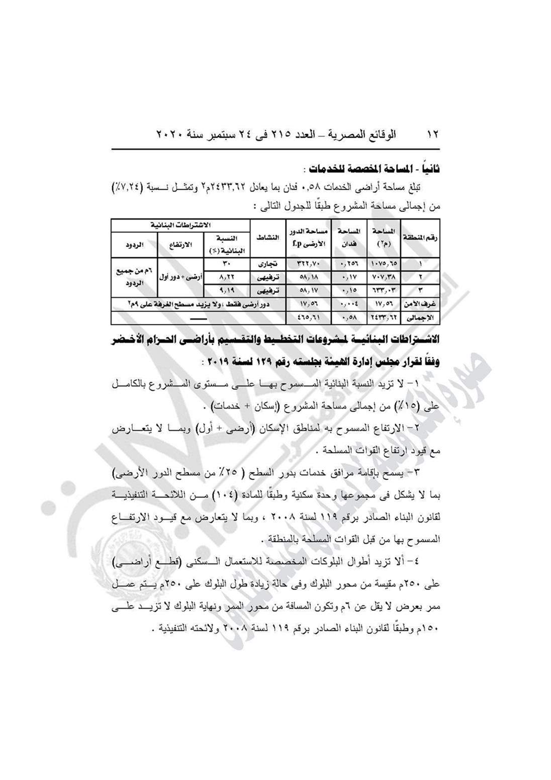 - القرار رقم 530 لسنة 2020، باعتماد تخطيط وتقسيم قطعة الأرض رقم (م2) بمساحة 8 أفدنة الواقعة بالحوض رقم 3 بالحزام الأخضر بمدينة 6 أكتوبر لإقامة نشاط (سكني- خدمات) بمقابل نقدي.
