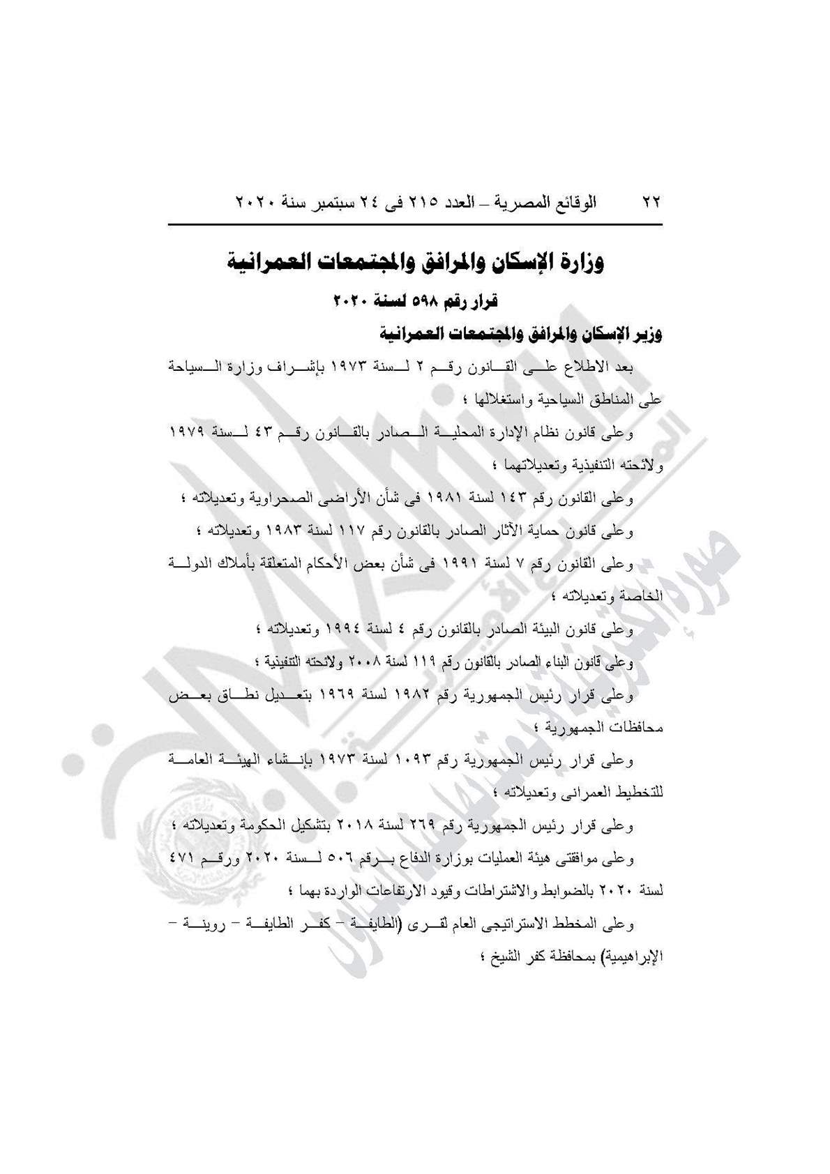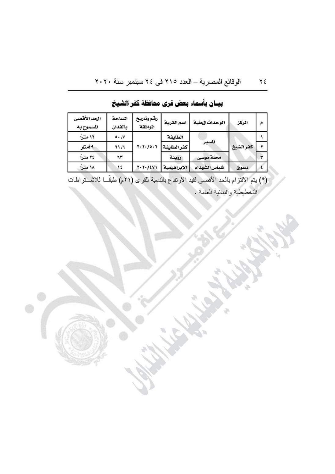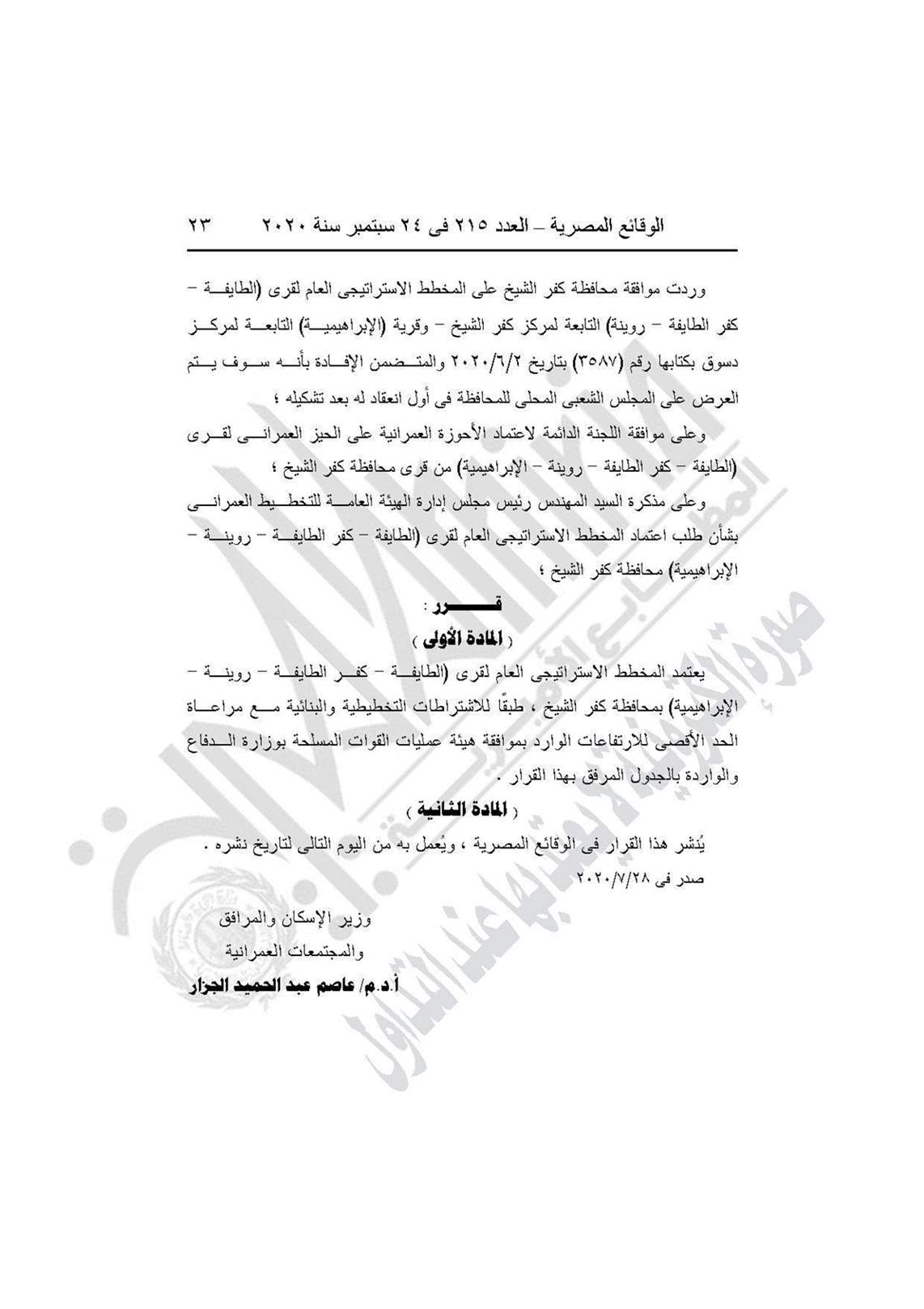- القرار رقم 598 لسنة 2020، باعتبار المخطط الاستراتيجي العام لقرى (الطايفة- كفر الطايفة- روينة- الإبراهيمية) بمحافظة كفر الشيخ، طبقا للاشتراطات التخطيطية والبنائية مع مراعاة الحد الأقصى للارتفاعات الواردة بموافقة هيئة عمليات القوات المسلحة بوزارة الدفاع.