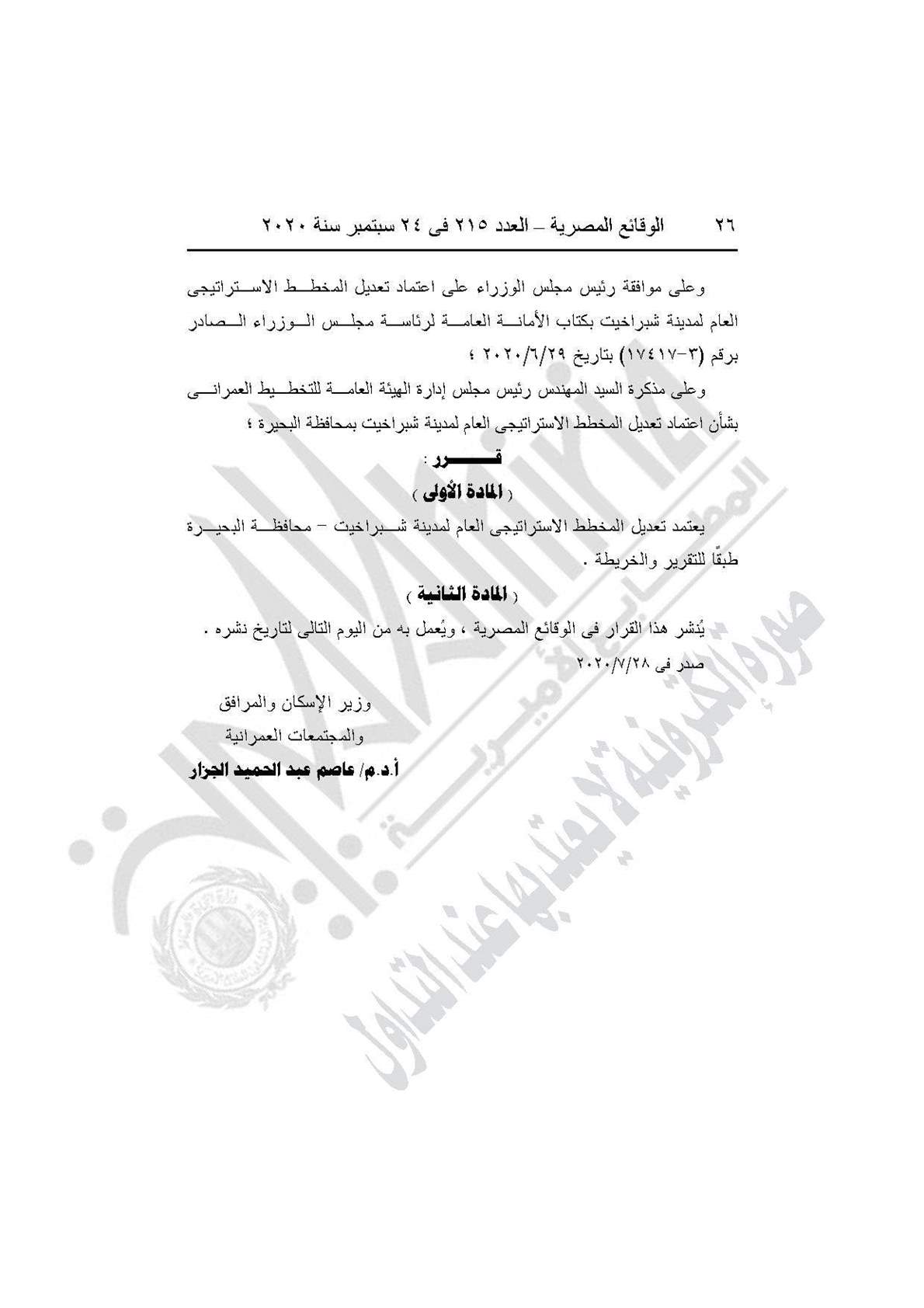 - القرار رقم 601 لسنة 2020، باعتماد تعديل المخطط الاستراتيجي العام لمدينة شبراخيت محافظة البحيرة.