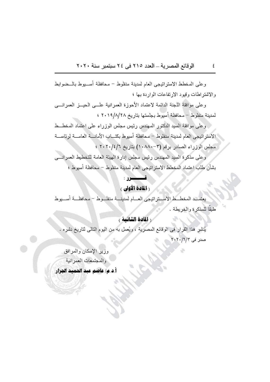 - القرار رقم 374 لسنة 2020، باعتماد المخطط الاستراتيجي العام لمدينة منفلوط محافظة أسيوط، طبقا للمذكرة والخريطة.