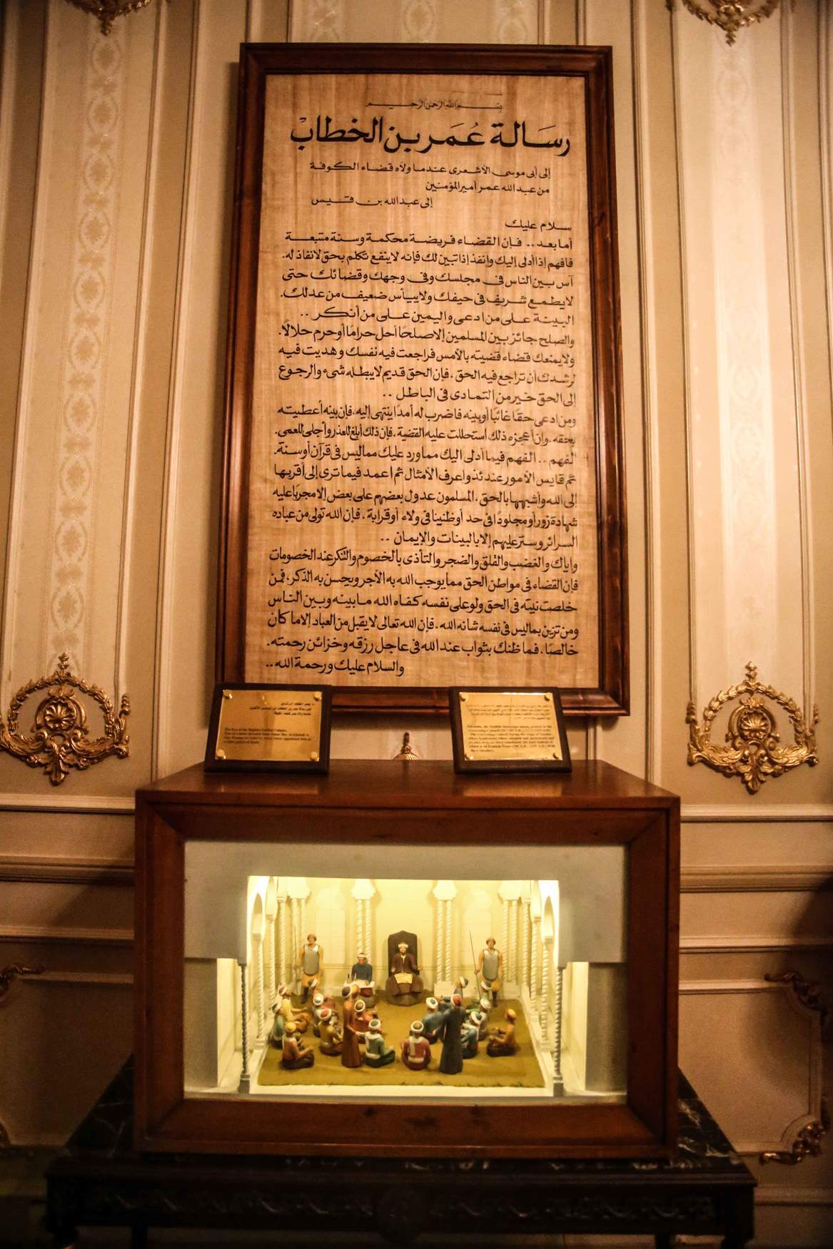 أما عن مقتنيات العصر الإسلامي فتوجد داخل القاعة الأولى من المتحف العديد من المقتنيات في مقدمتها نسخة من القرآن الكريم، المصدر الرئيسي للتشريع في الدولة الإسلامية، وصورة بعض الرسائل والمخطوطات منها رسالة من وإلى مصر في العصر العباسي يحث فيها أهل النوبة على الالتزام بالمواثيق والمعاهدات، ورسالة عمر بن الخطاب لأبي موسى الأشعري عندما ولاه قضاء الكوفة.