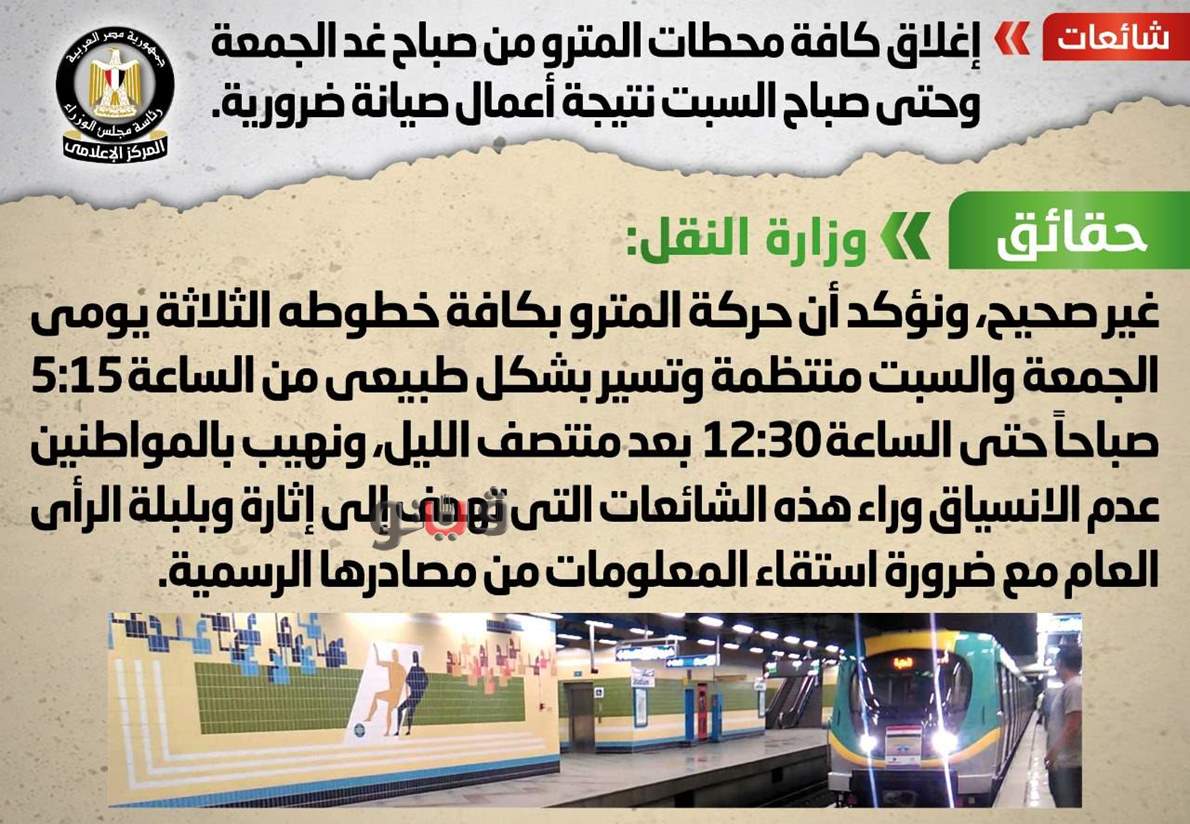 نفى المركز الإعلامي بمجلس الوزراء ما تداولته بعض المواقع الإلكترونية وصفحات التواصل الاجتماعي من أنباء بشأن إغلاق كافة محطات المترو من صباح غد الجمعة وحتى صباح السبت نتيجة أعمال صيانة ضرورية.