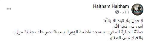 وأكد المدير الفني لسيراميكا عبر صفحته الشخصية علي موقع التواصل الإجتماعي "فيس بوك" : "أمي في ذمة الله وصلاة الجنازة المغرب بمسجد فاطمة الزهراء بمدينة نصر والعزاء علي المقابر".