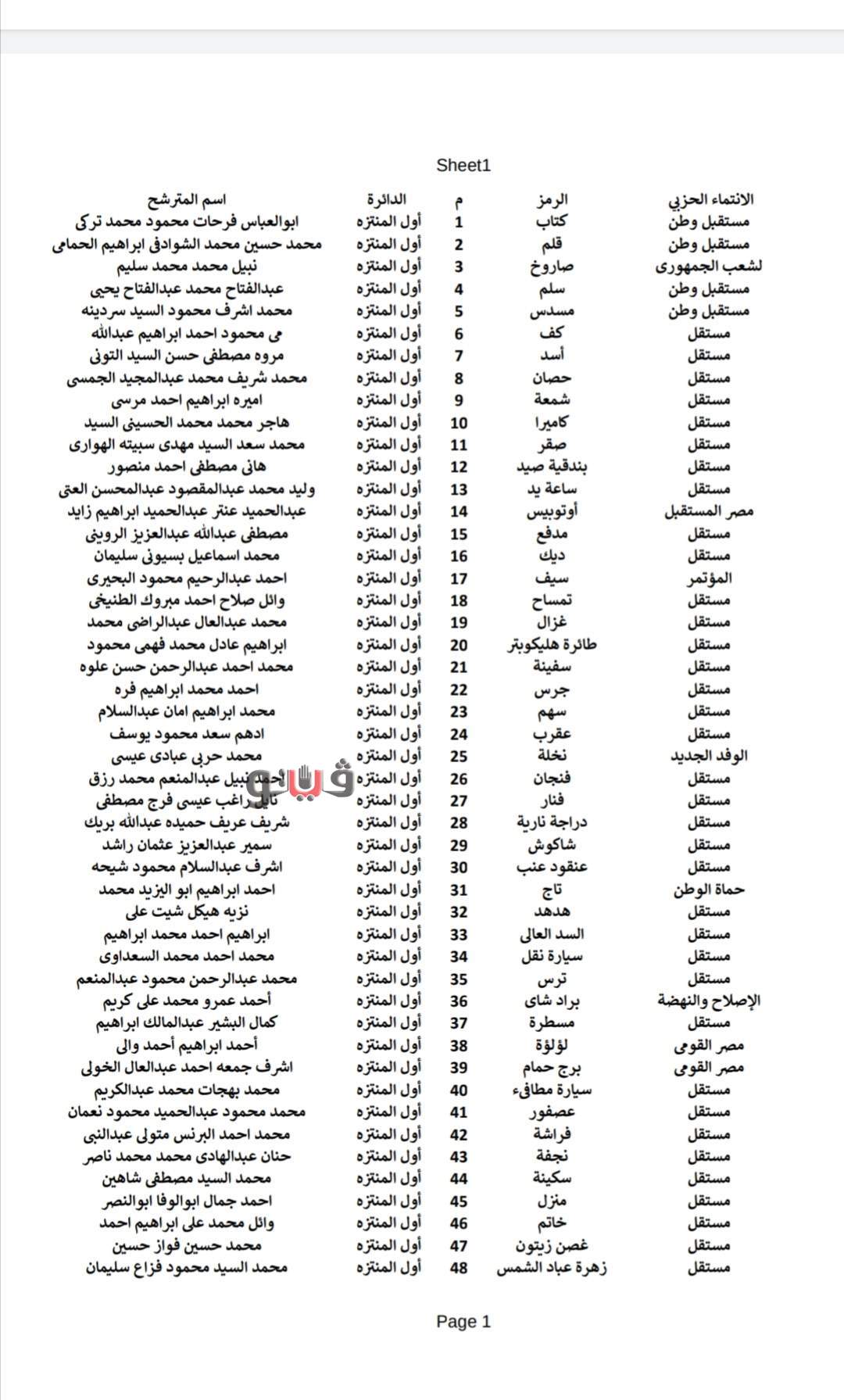 وحصلت فيتو " علي قائمة بأسماء كافة المرشحين الذين تقدموا بأوراقهم حتي اليوم، وتقدم مرشح لحزب النور عن دائرة المنتزة اول، فيما تقدم عضو الحزب حسنى المصري بأوراق ترشحه مستقل رغم إعلان الحزب عن أنه مرشحه.