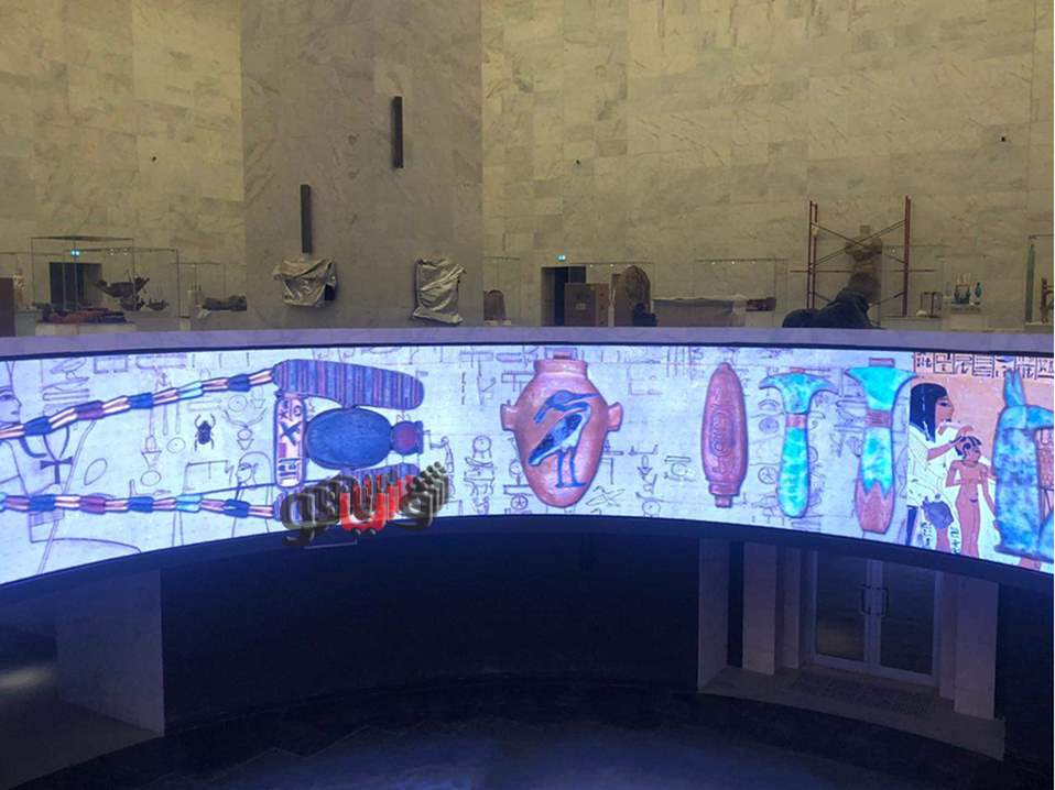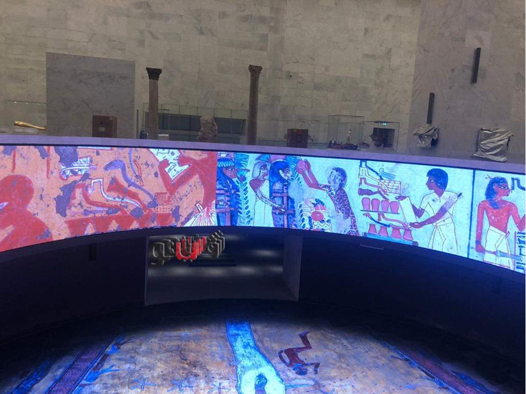 وأوضح إيهاب عبد الحميد مدير نظم تكنولوجيا المعلومات بهيئة المتحف أن عرض المالتيميديا يتكون من شاشتين عرض تفاعلية ضخمة، شاشة الدائرة على شكل دائرة قطرها 11 مترا، تعلوها شاشة ثانية على شكل حلقة ارتفاعها 2 متر وقطرها 11مترا بطول 18 مترا وهي مكملة لشاشة الدائرة حيث يوجد تزامن في عرض المحتوى بين الشاشتين.