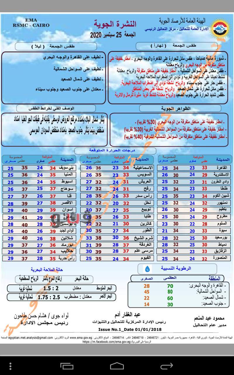 وفيما يلى بيان بدرجات الحرارة المتوقعة اليوم على مدن ومحافظات مصر..