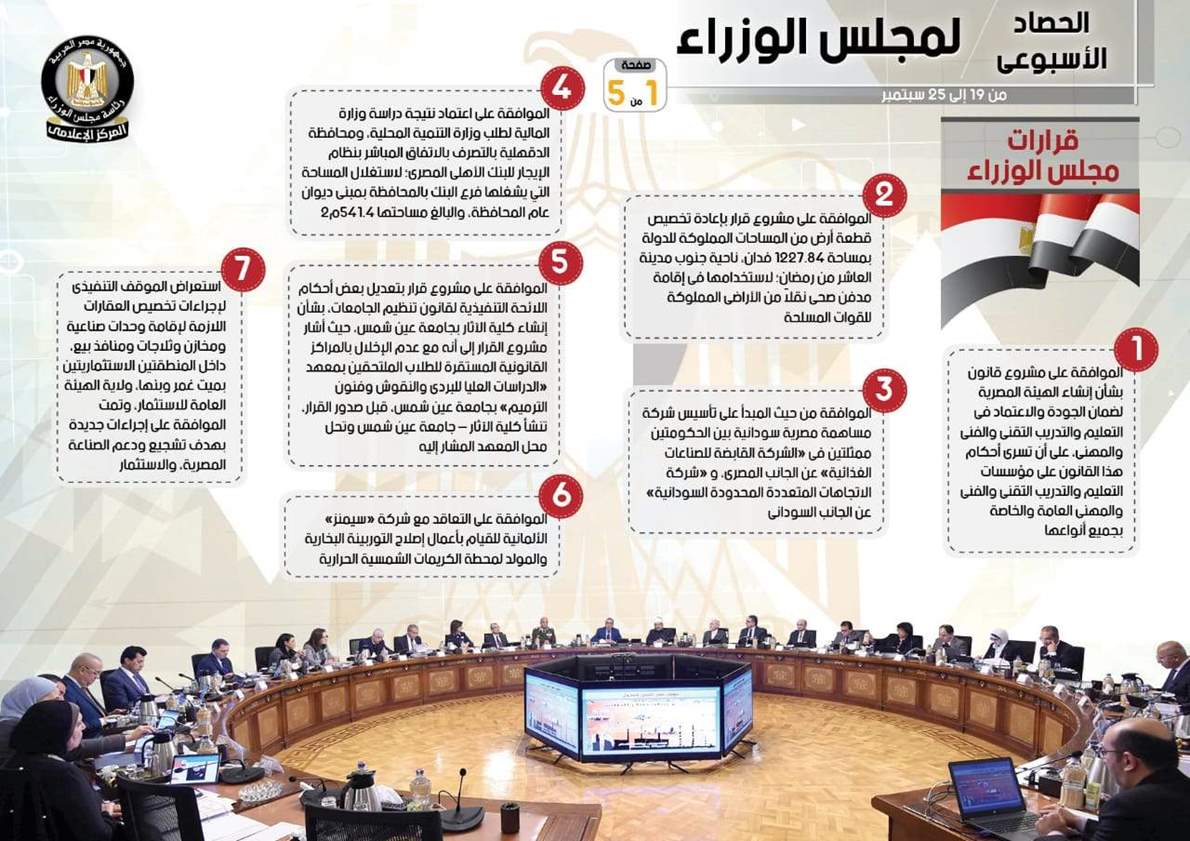 وجاء في التقرير أنه تم إصدار عدد من القرارات، تشمل قراراً بالموافقة على مشروع قانون بشأن إنشاء الهيئة المصرية لضمان الجودة والاعتماد في التعليم والتدريب التقني والفني والمهني، على أن تسري أحكام هذا القانون على مؤسسات التعليم والتدريب التقني والفني والمهني العامة والخاصة بجميع أنواعها، وكذلك الموافقة على مشروع قرار بإعادة تخصيص قطعة أرض من المساحات المملوكة للدولة بمساحة 1227.84 فدان، ناحية جنوب مدينة العاشر من رمضان؛ لاستخدامها في إقامة مدفن صحي نقلاً من الأراضي المملوكة للقوات المسلحة، بجانب الموافقة من حيث المبدأ على تأسيس شركة مساهمة مصرية سودانية بين الحكومتين ممثلتين في "الشركة القابضة للصناعات الغذائية" عن الجانب المصري، و"شركة الاتجاهات المتعددة المحدودة السودانية" عن الجانب السوداني.