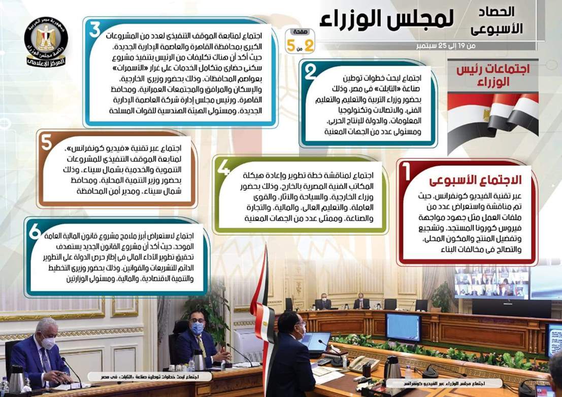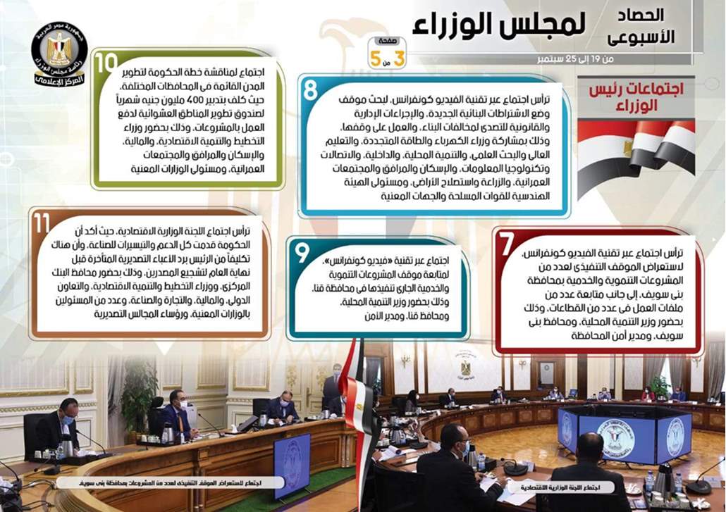 نشر المركز الإعلامي لمجلس الوزراء، تقريراً شمل إنفوجرافات سلط من خلالها الضوء على الحصاد الأسبوعي لمجلس الوزراء، وذلك خلال الفترة من 19 حتى 25 سبتمبر 2020، والذي تضمن الموافقة على عدد من القرارات، فضلاً عن الاجتماعات التي عقدها الدكتور مصطفى مدبولي، رئيس مجلس الوزراء، بالإضافة إلى ما قام به من أنشطة.