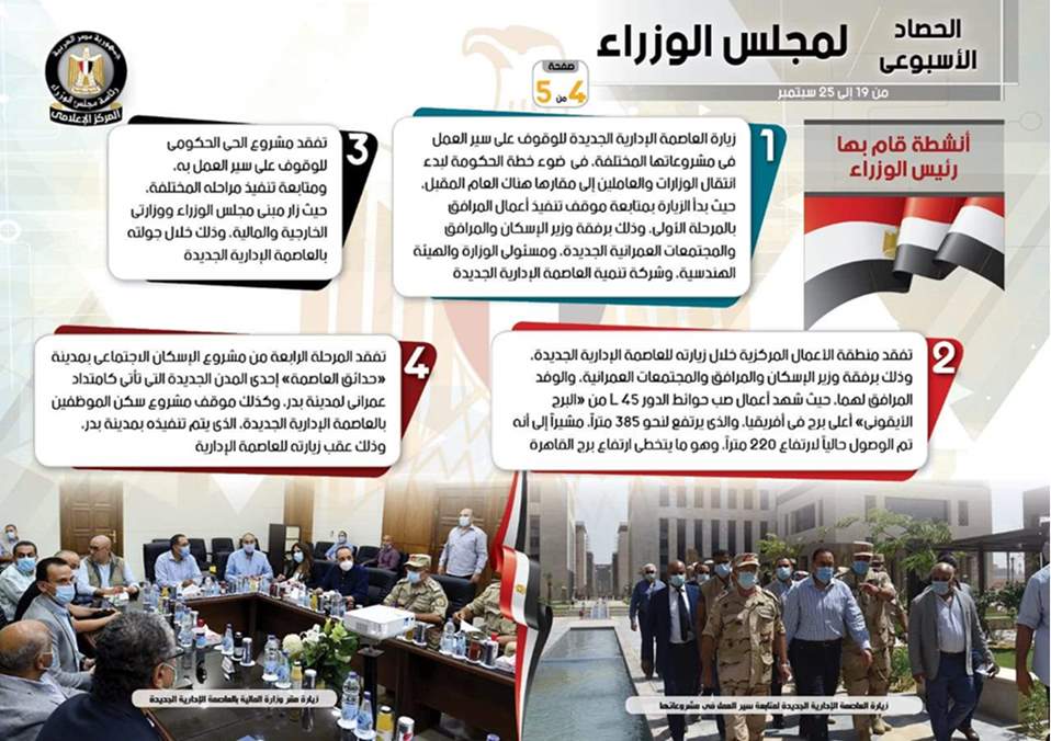 وبشأن الأنشطة التي قام بها رئيس مجلس الوزراء، فبحسب التقرير، شملت قيام سيادته بزيارة العاصمة الإدارية الجديدة للوقوف على سير العمل في مشروعاتها المختلفة، في ضوء خطة الحكومة لبدء انتقال الوزارات والعاملين إلى مقارها هناك العام المقبل، حيث بدأ الزيارة بمتابعة موقف تنفيذ أعمال المرافق بالمرحلة الأولى، وذلك برفقة وزير الإسكان والمرافق والمجتمعات العمرانية الجديدة، ومسئولي الوزارة والهيئة الهندسية، وشركة تنمية العاصمة الإدارية الجديدة، بجانب تفقد مشروع الحي الحكومي للوقوف على سير العمل به، ومتابعة تنفيذ مراحله المختلفة، حيث زار مبنى مجلس الوزراء ووزارتي الخارجية والمالية، وذلك خلال جولته بالعاصمة الإدارية الجديدة، فضلاً عن تفقد منطقة الأعمال المركزية خلال زيارته للعاصمة الإدارية الجديدة، وذلك برفقة وزير الإسكان والمرافق والمجتمعات العمرانية، والوفد المرافق لهما، حيث شهد أعمال صب حوائط الدور L 45 من "البرج الأيقوني" أعلى برج في أفريقيا، والذي يرتفع لنحو 385 متراً، مشيراً إلى أنه تم الوصول حالياً لارتفاع 220 مترا، وهو ما يتخطى ارتفاع برج القاهرة.