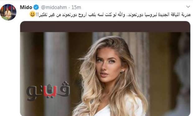 ونشر "ميدو" عبر صفحته الشخصية بموقع التواصل الاجتماعي "تويتر" صورة مدربة دورتموند الجديدة وكتب: "مدربة اللياقة الجديدة لبروسيا دورتموند، والله لو كنت لسه بلعب أروح دورتموند من غير تفكير".