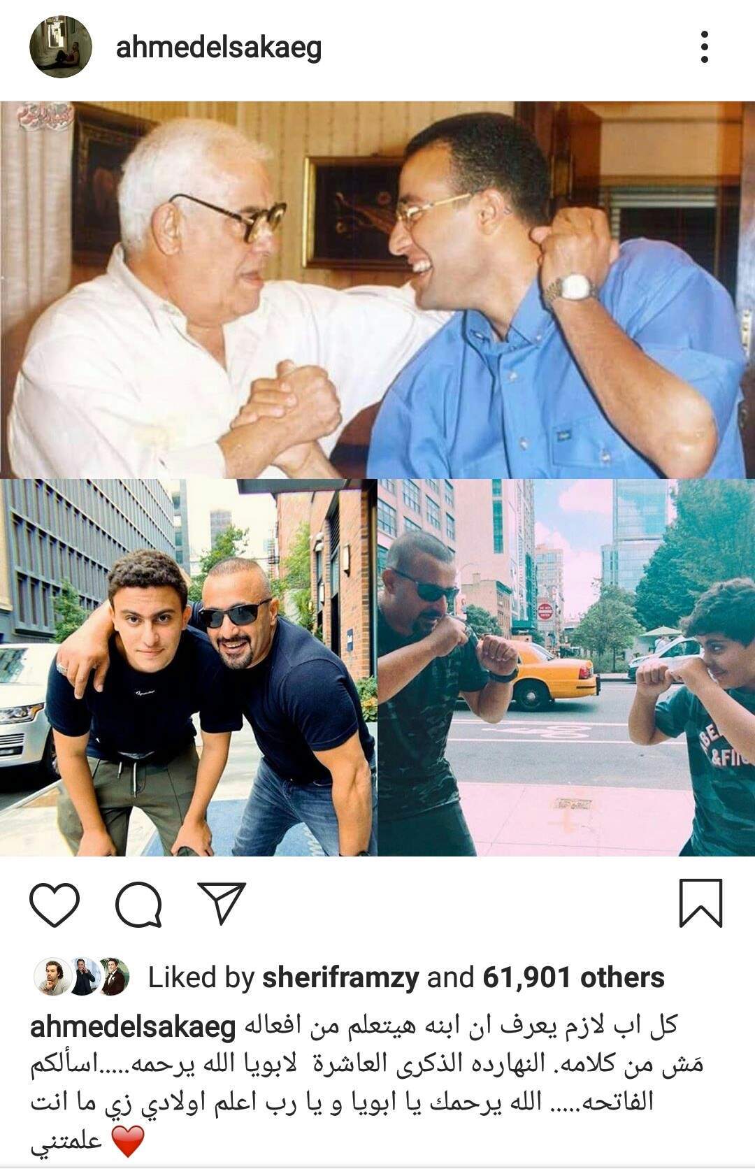 ونشر أحمد السقا 3 صور إحداها مع والده في حين أن الصورتين الآخريين كانتا مع أبنائه، حيث علق عليها قائلا: "كل أب لازم يعرف إن ابنه هيتعلم من أفعاله مَش من كلامه.. النهاردة الذكرى العاشرة.. لابويا الله يرحمه.. أسألكم الفاتحة.. الله يرحمك يا أبوية ويا رب أعلم أولادى زى ما انت علمتى".