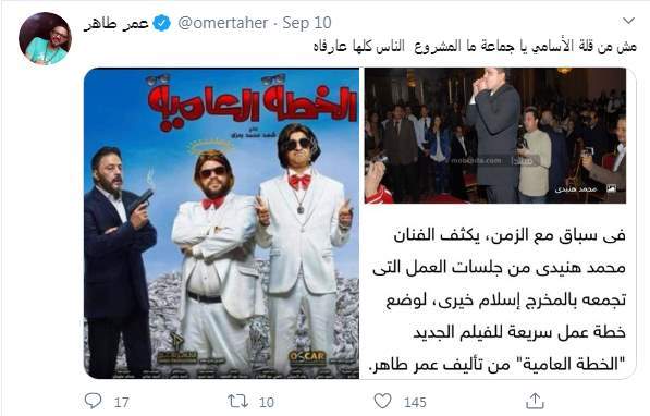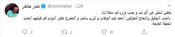 ويتبعها "طاهر" بتغريدة جديدة وأخيرة مساء أمس الجمعة قال فيها: " بغض النظر عن أي شد و جذب وارد في شغلانتنا.. بتمنى التوفيق والنجاح للمؤلفين: أحمد عبد الوهاب و كريم سامي و المخرج معتز التوني في فيلمهم الجديد الخطة العايمة".