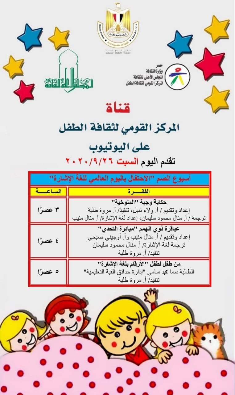 و كان قد أعلن الكاتب محمد ناصف رئيس المركز عن تنظيم المركز القومي لثقافة الطفل أسبوعاًللصم؛ بعرض ١٤ من فيديوهات المركز مترجمة للغة الإشارة على قناته على اليوتيب مختارة من كل البرامج التى تقدم على قوائم التشغيل؛ حيث تعرض القناة فيديوهين مترجمين للغة الإشارة يوميًا.