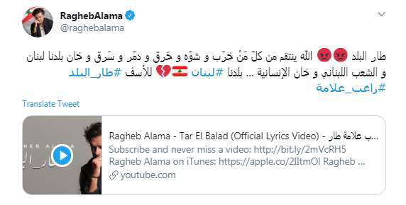 وكتب راغب علامة تغريدة على تويتر "طار البلد.. الله ينتقم من كلّ مَنْ خرّب وشوّه وحَرق ودمّر وسَرق وخان بلدنا لبنان والشعب اللبناني وخان الإنسانية... بلدنا #لبنان للأسف #طار_البلد #راغب_علامة"