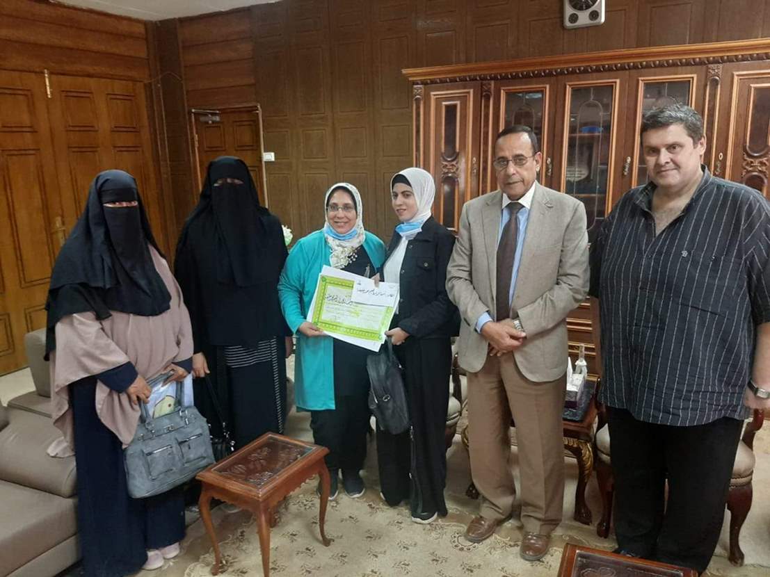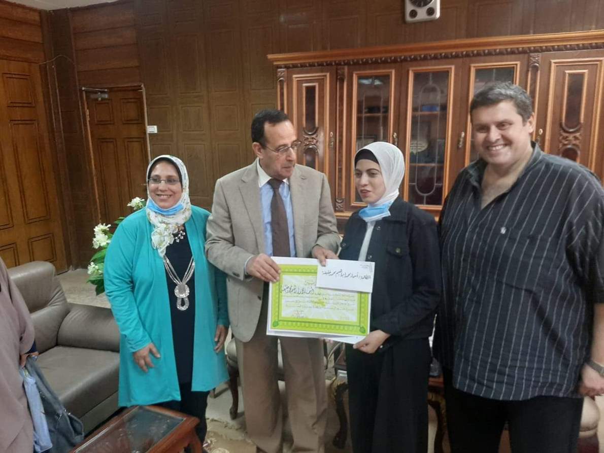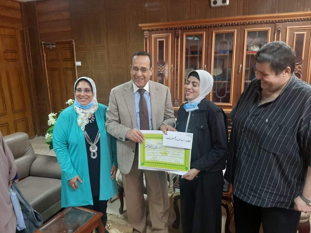 واستقبل المحافظ حمزة رضوان وكيل مديرية التربية والتعليم بالمحافظة والدكتورة عزة كمال مدير ادارة التربية الخاصة بمديرية التربية والتعليم وبرفقتهما الطالبة أسماء محمد إبراهيم خليفة من مدرسة النور للمكفوفين .. حيث تم تكريمها بمنحها شهادة تقدير وجائزة مالية نظير تفوقها فى الثانوية العامة هذا العام .