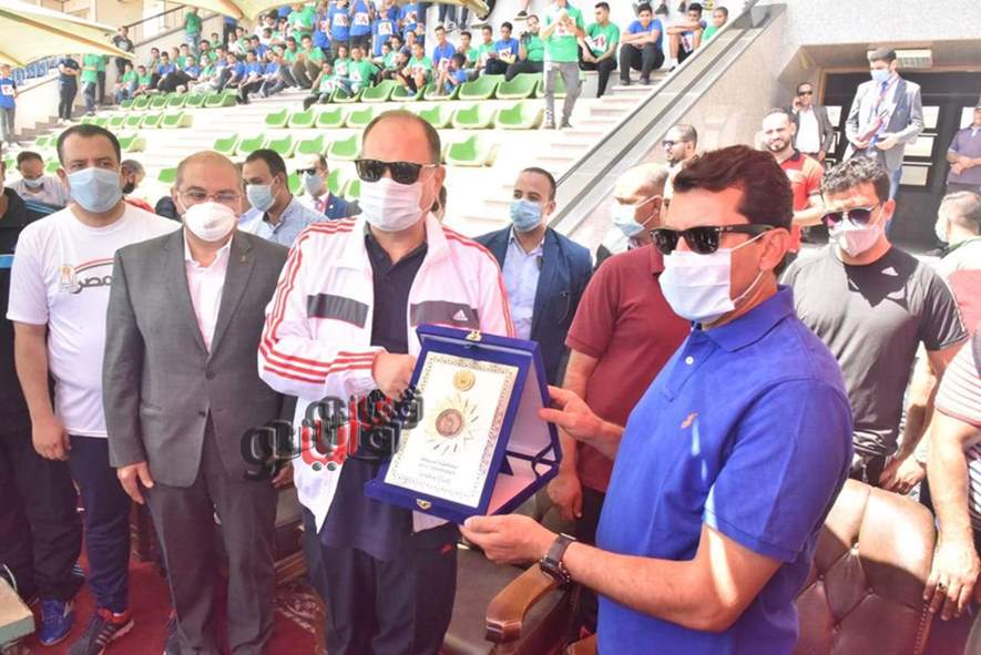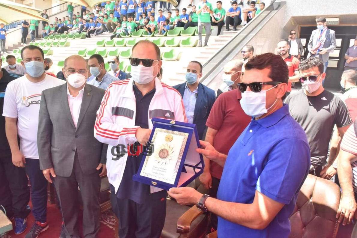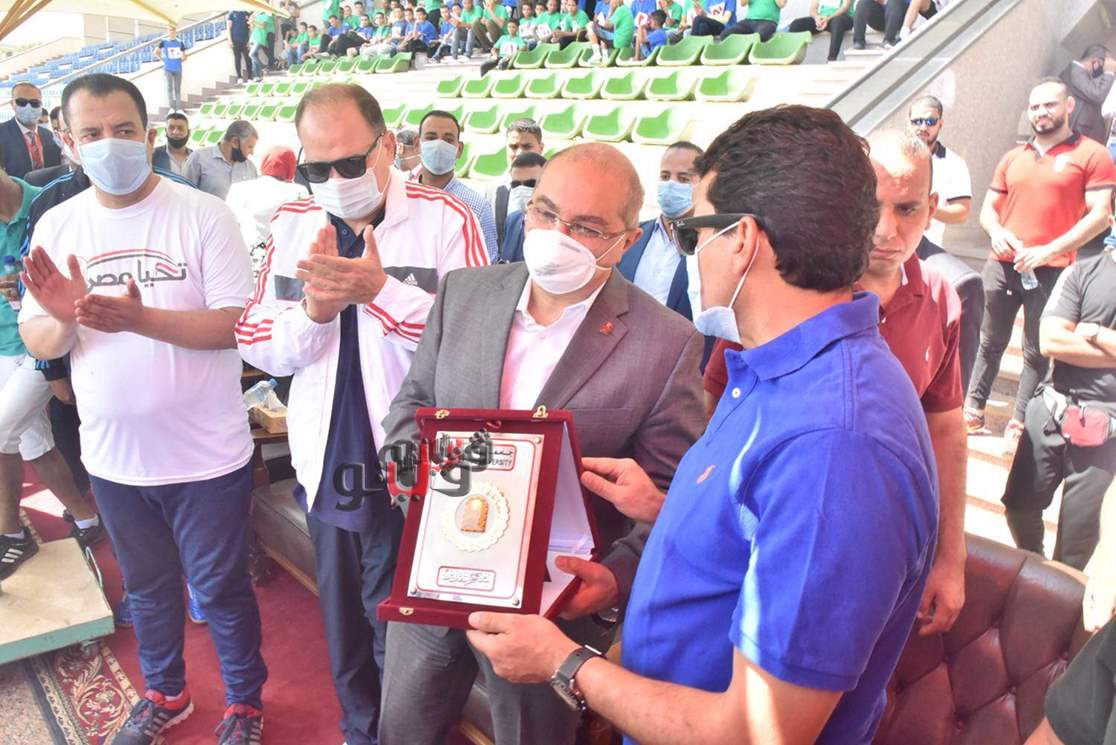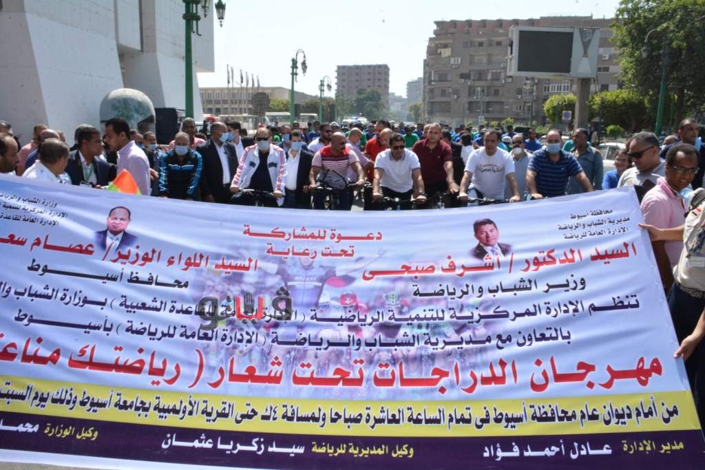 وزير الرياضة يتبادل الدروع مع محافظ ورئيس جامعة أسيوط بماراثون الدراجات الهوائية | صور